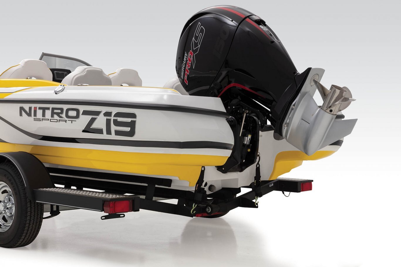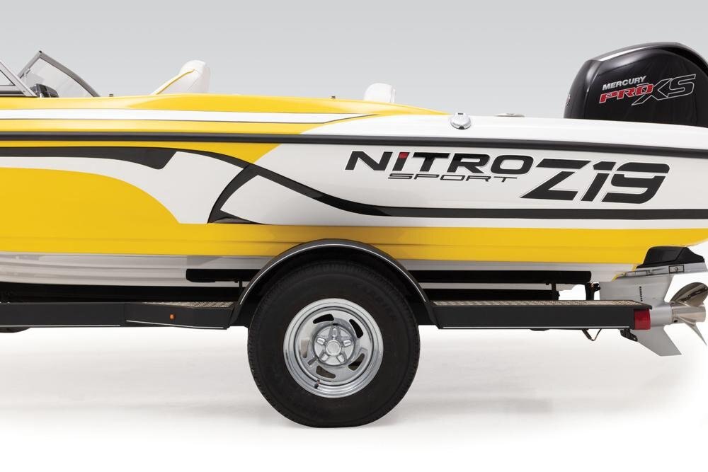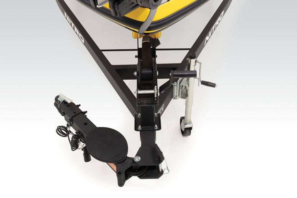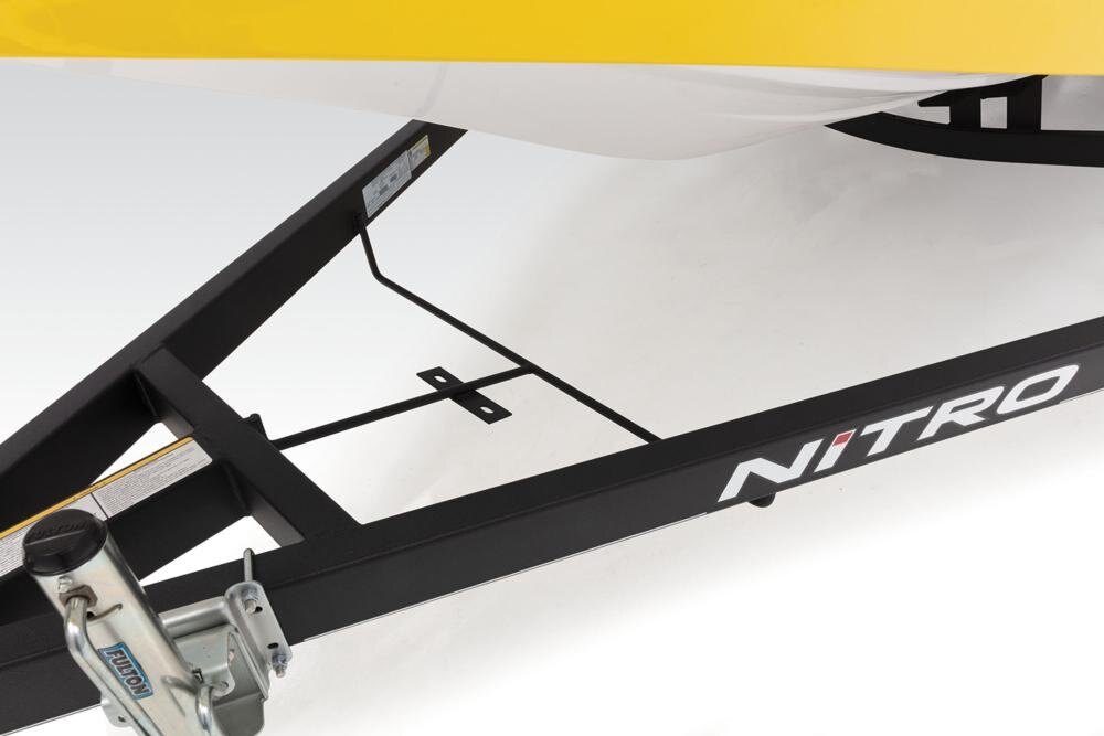 Custom-fit, single-axle NITRO® trailer powdercoated w/GALVASHIELD® Impact corrosion & chip protection for improved durability 7-pin connector 14" (35.56 cm) chrome wheels w/radial tires Spare tire carrier (spare tire optional) All-welded rectangular GALVASHIELD® frame Space-saving swing-away tongue to reduce storage length Fold-away tongue jack Heavy-duty winch w/nylon strap & bow safety strap Outboard motor support to reduce hull & transom stress while towing Carpeted bunks & fender boards to protect hull Submersible LED lighting Nylon tie-down straps (supplied w/boat package) Safety cables