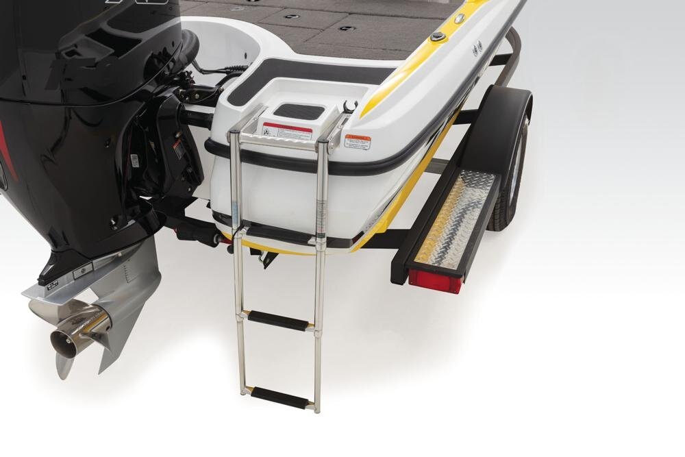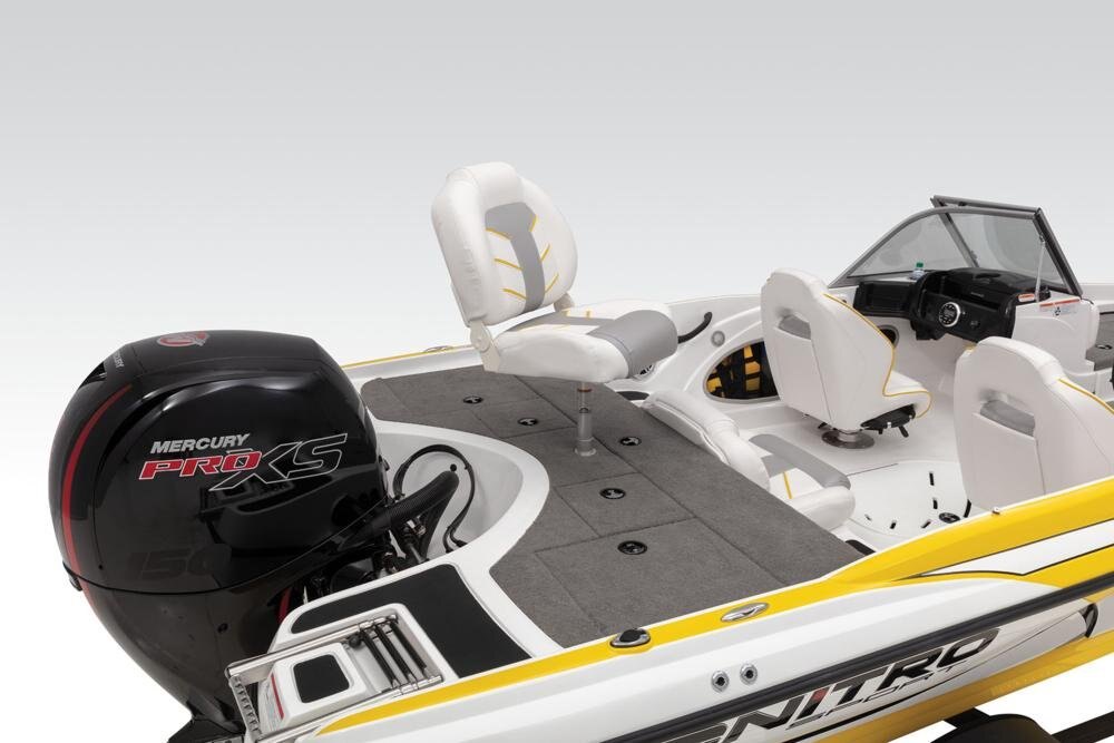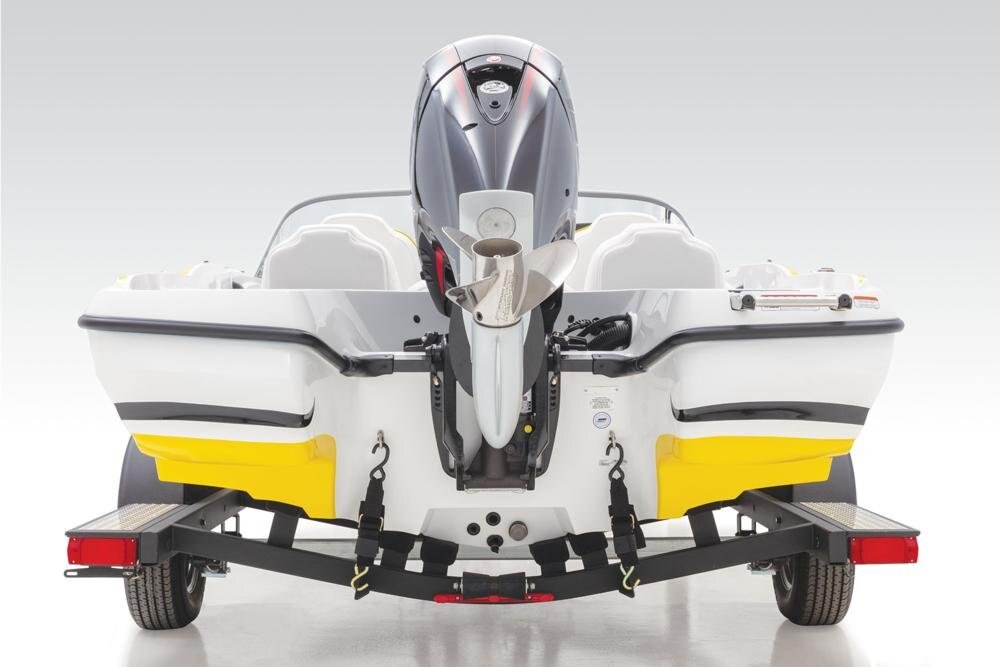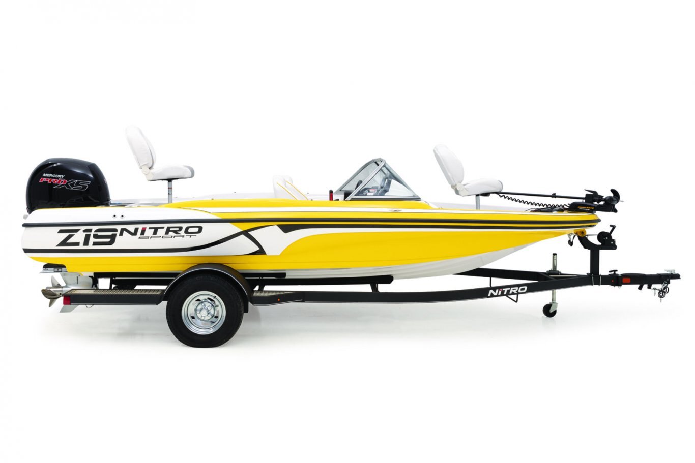 Custom-fit, single-axle NITRO® trailer powdercoated w/GALVASHIELD® Impact corrosion & chip protection for improved durability 7-pin connector 14" (35.56 cm) chrome wheels w/radial tires Spare tire carrier (spare tire optional) All-welded rectangular GALVASHIELD® frame Space-saving swing-away tongue to reduce storage length Fold-away tongue jack Heavy-duty winch w/nylon strap & bow safety strap Outboard motor support to reduce hull & transom stress while towing Carpeted bunks & fender boards to protect hull Submersible LED lighting Nylon tie-down straps (supplied w/boat package) Safety cables