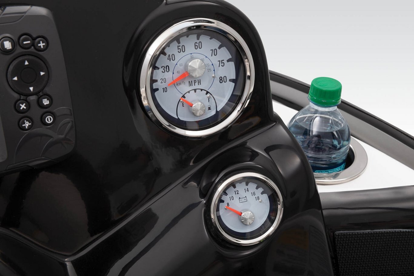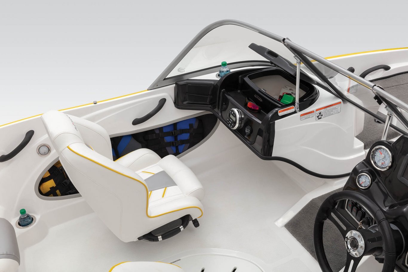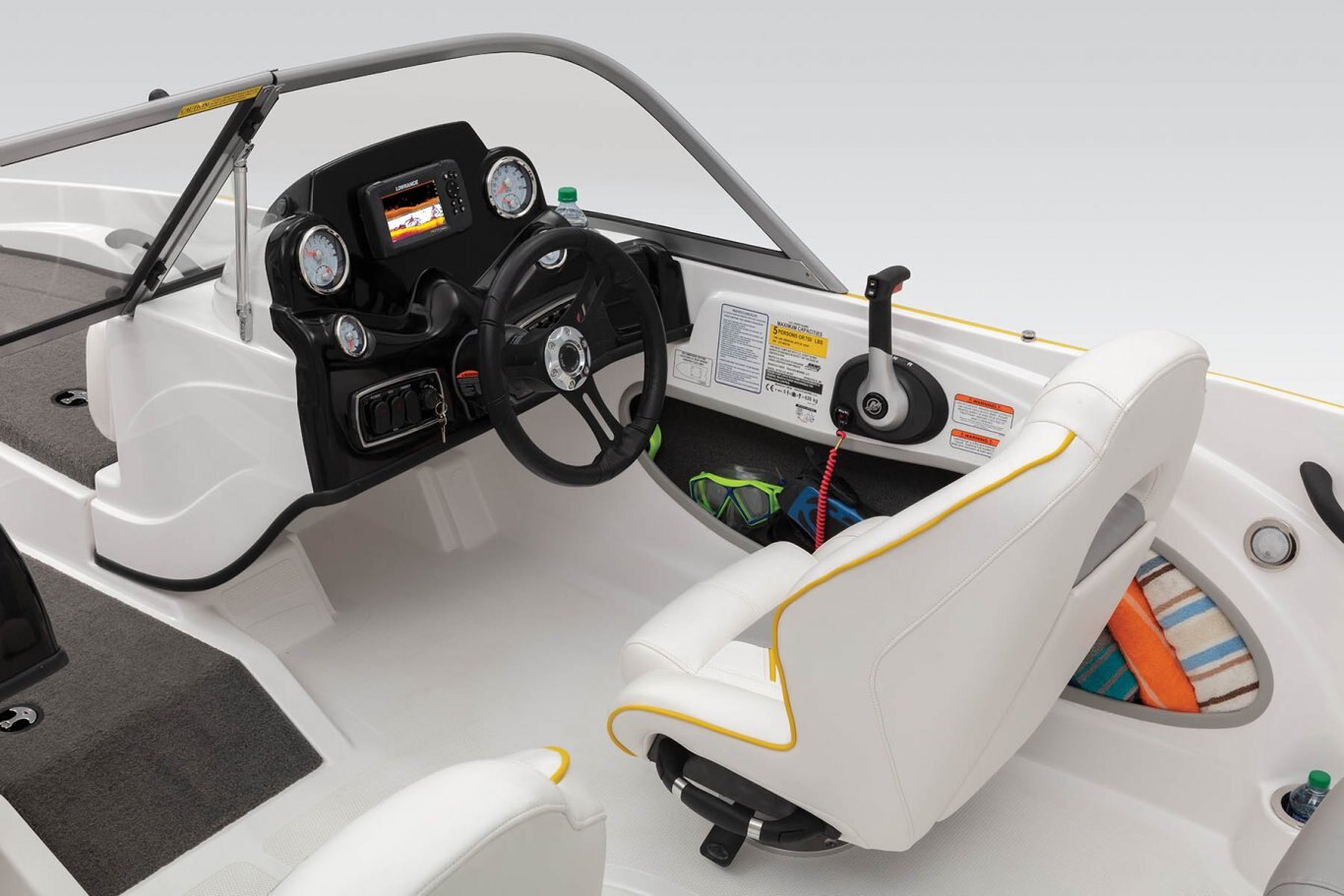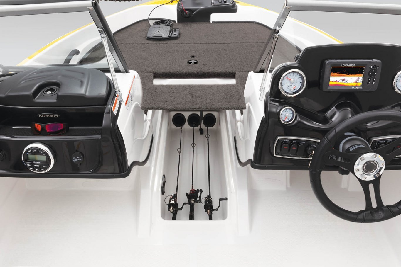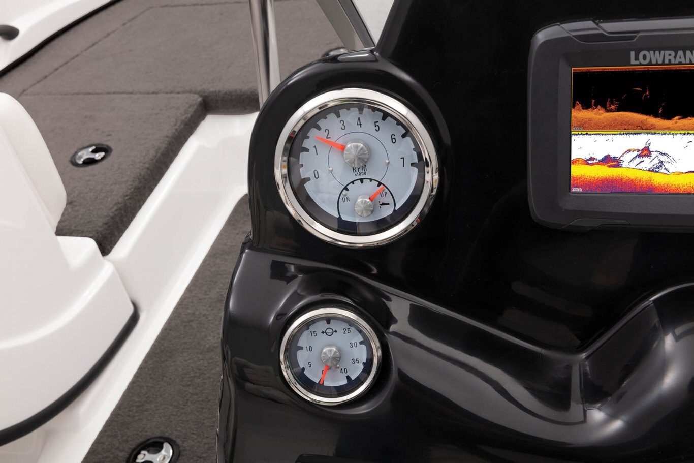 NEW Lowrance® HOOK Reveal 5C flush-mounted fishfinder Radiused walk-thru, tempered-glass windshield Custom-molded port & starboard consoles Port console w/storage tray & insulated cooler AM/FM Bluetooth®-capable stereo w/USB & MP3 ports Veethree® multifunction instrumentation gauges Water-resistant switch panels