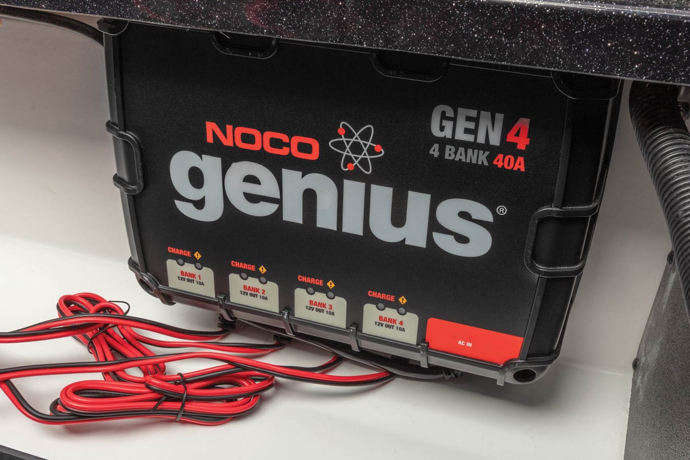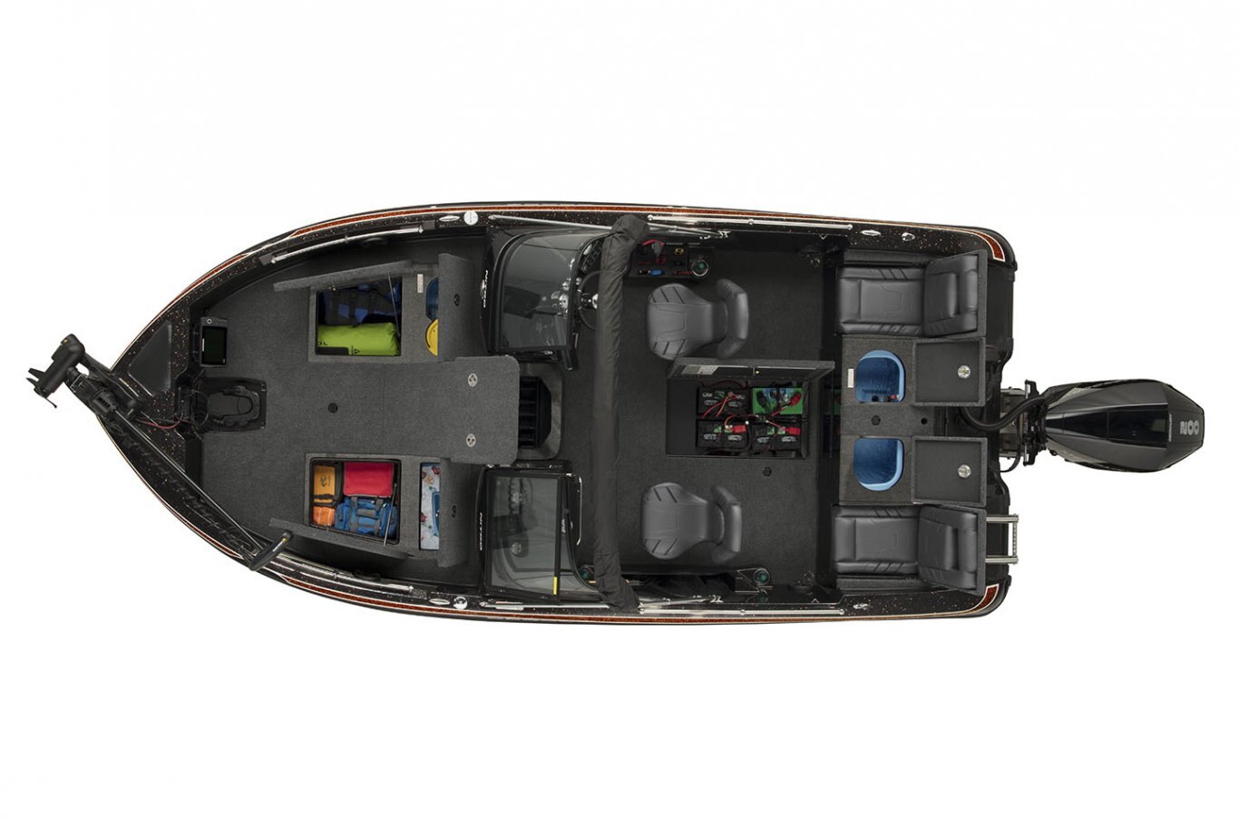 Bow panel w/trolling motor receptacle, navigation light, anchor light & trim switches Manual LED-lighted bow storage compartments Heavy-duty Interstate® starting battery 2 heavy-duty Interstate® trolling batteries Console-mounted 12V outlet 6-gauge trolling motor wiring w/50-amp circuit breaker E-Start emergency jump start system Master power switch Automotive-style labeled fuse panel w/cover Waterproof Deutsch gauge plugin connectors Water/abrasion-resistant connectors