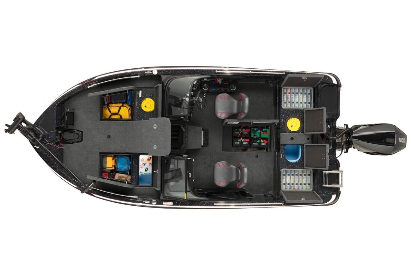 Bike seat w/pedestal Attwood® Centric X folding molded fishing seat w/pedestal Attwood® Centric X driver & passenger seats Stainless steel bow & aft rails (port & starboard) Bow port & starboard lockers w/lift assists Bow port cooler w/removable tray Bow & aft lockable storage compartments 3-level center rod locker for rods up to 8' (2.44 m) w/tapered rod tubes to protect rod tips Step to bow deck w/storage for two 3600 tackle boxes Extra-large integrated port net holder Footrest w/non-skid mat under console Midship in-floor storage for batteries Starboard tool holder Built-in tournament ruler & holder 2 lift-out, molded aft storage boxes that will each accept seven 3700 tackle trays Easy access to rigging & pumps Insulated aluminum lids w/welded corners 24-oz. (.68 kg) plush, marine-grade, cut pile carpet on decks & floor Room to RAM®-mount additional electronics at bow Stainless steel lockable latches