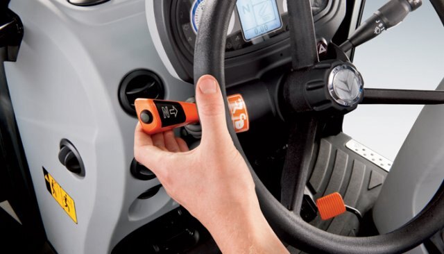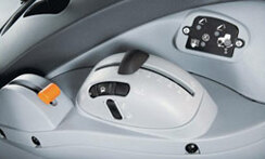 The column-mounted electrohydraulic Powershuttle can be conveniently operated without taking your hand off the steering wheel, helping to enhance your safety during loader work. You can conveniently regulate the aggressiveness setting, even while moving, with an the ergonomically positioned switch on the B pillar. A softer setting is perfect for general field work, while a more aggressive setting is great for near instantaneous direction changes during loader work.