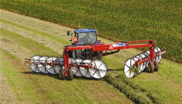 An offset wheel design places eight 60-inch raking wheels on the left side and nine on the right, allowing 30-foot raking widths without the need for a center kicker wheel. So you get uniform dry down while traveling at speeds of up to 15 miles per hour. |