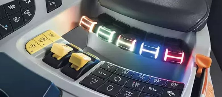 THREE-POINT LINKAGE LIMITSToward the rear on the right side of the armrest are the three-point hitch limit settings and four configurable controls. These can be assigned for different functions, such as a rear hydraulic top link. Controls are located for easy adjustment when you’re looking back at the implement. |