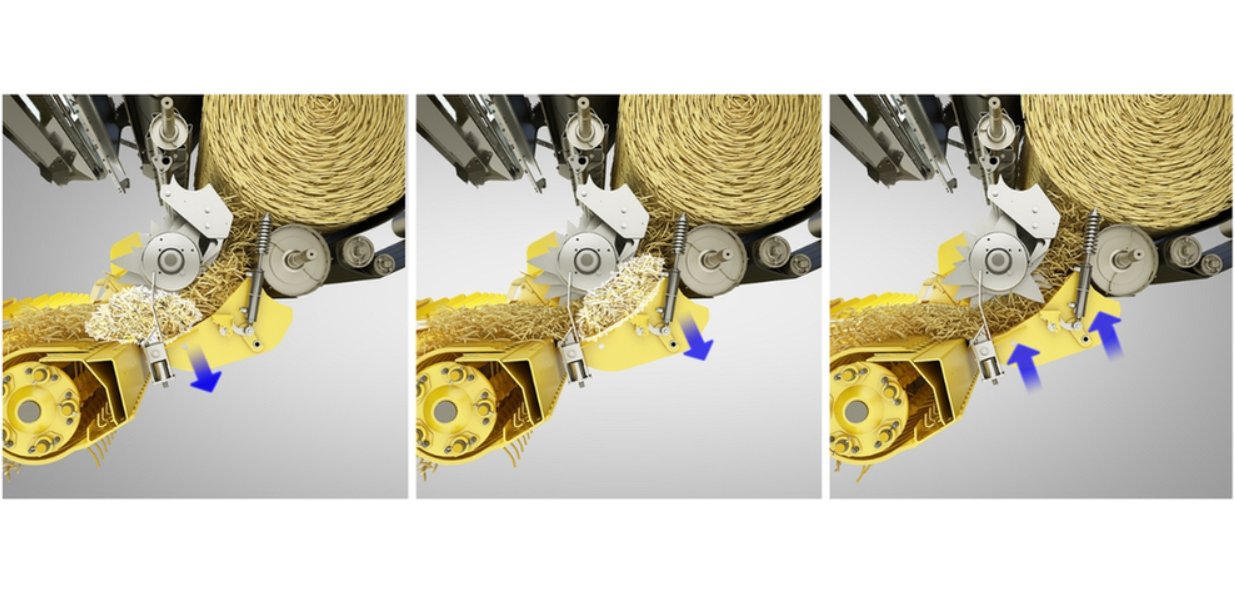 EFFICIENT MAXISWEEP™ PICKUPA baler with a big appetite is nothing without a pickup and feeding system that can keep it full. The path to perfect, square-shouldered bales starts with the heavy-duty MaxiSweep pickup. The reliable twin-cam drive, 160 tines, and five-bar reel deliver a clean sweep, high capacity, and the strength to handle big windrows at a fast pace. To improve visibility and crop flow, the pickup mounting angle is moved forward slightly and the roller and tine windguard is fully adjustable. | |
