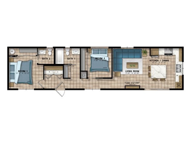 2 bed | 2 bath | 770 sq.ft Single Wide, Mobile Home 56' x 14' Exterior