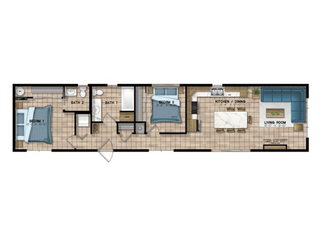 2 bed | 2 bath | 825 sq.ft Single Wide, Mobile Home 60' x 14' Exterior