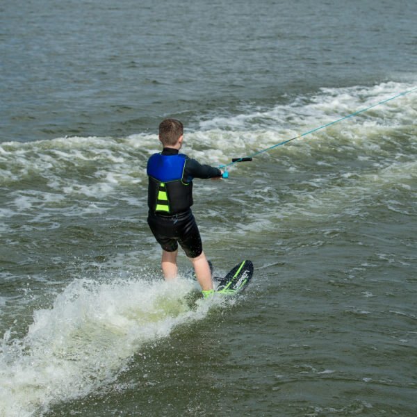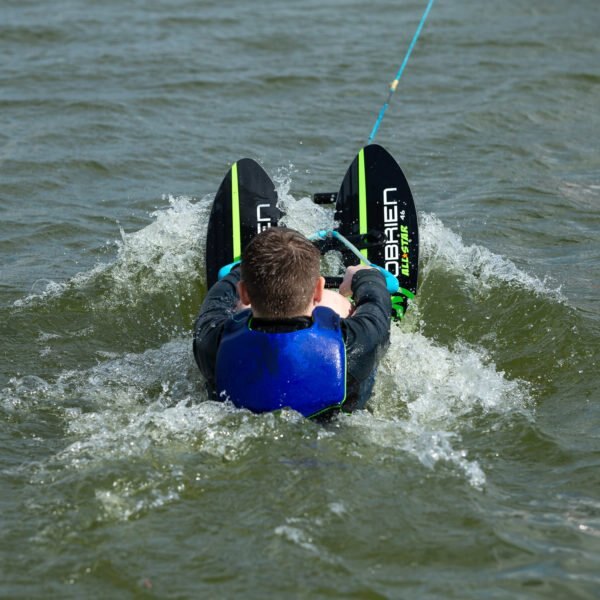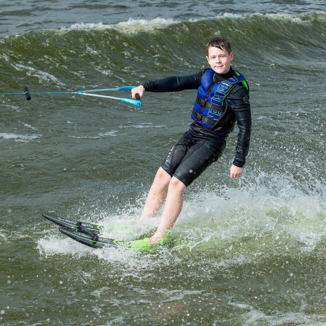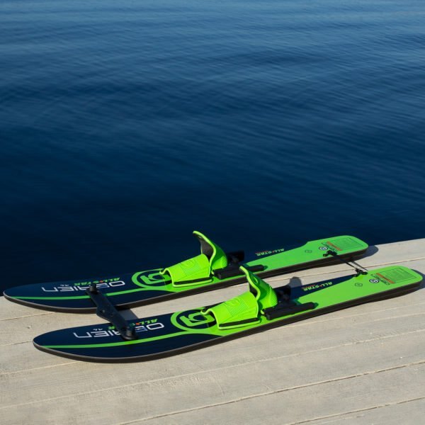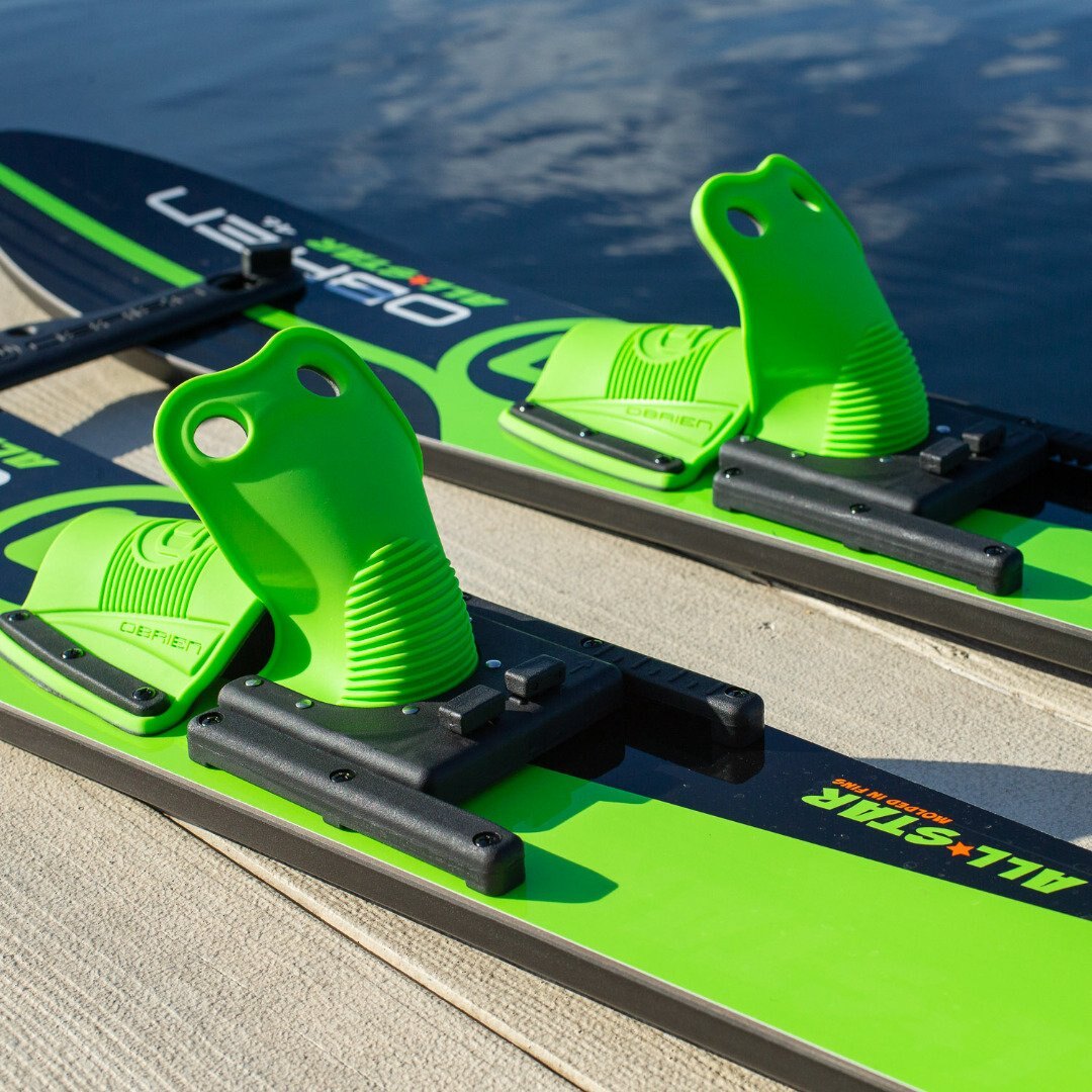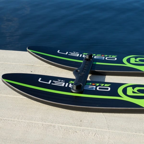 When itÌs time to teach the kids to ski, the All-Star Trainers are the ultimate training tool! When you get a pair of All-Star Trainers, you are really getting a training system. These 46-inch skis come with a stabilizer/trainer bar that prevents the skis from doing the ÏsplitsÓ and keeps them level. They also come with two ropes as part of the package; a short training rope with a handle that connects to the stabilizer/trainer bar at the front of the skis that the skier holds on to, and a longer rope with a handle to be held by an experienced observer in the boat. With this system, the observer can release the skier if they fall, taking the pressure off the kid. This system makes it incredibly easy to get them up and skiing with minimal drama. Supports a weight range up to 85 pounds with kid-sized adjustable bindings. These skis feature a dual tunnel bottom which track great and create lots of lift. Molded-in fins are unbreakable and provide outstanding stability. The All-Stars are the perfect system for turning your kids into waterskiers!