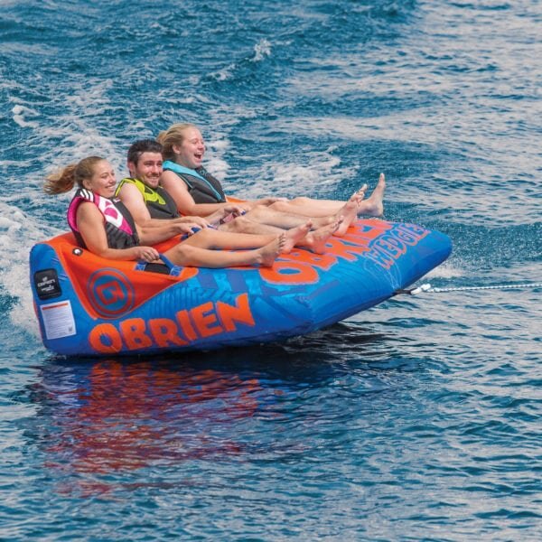 This OÌBrien towable boat tube has a capacity of 3 people.