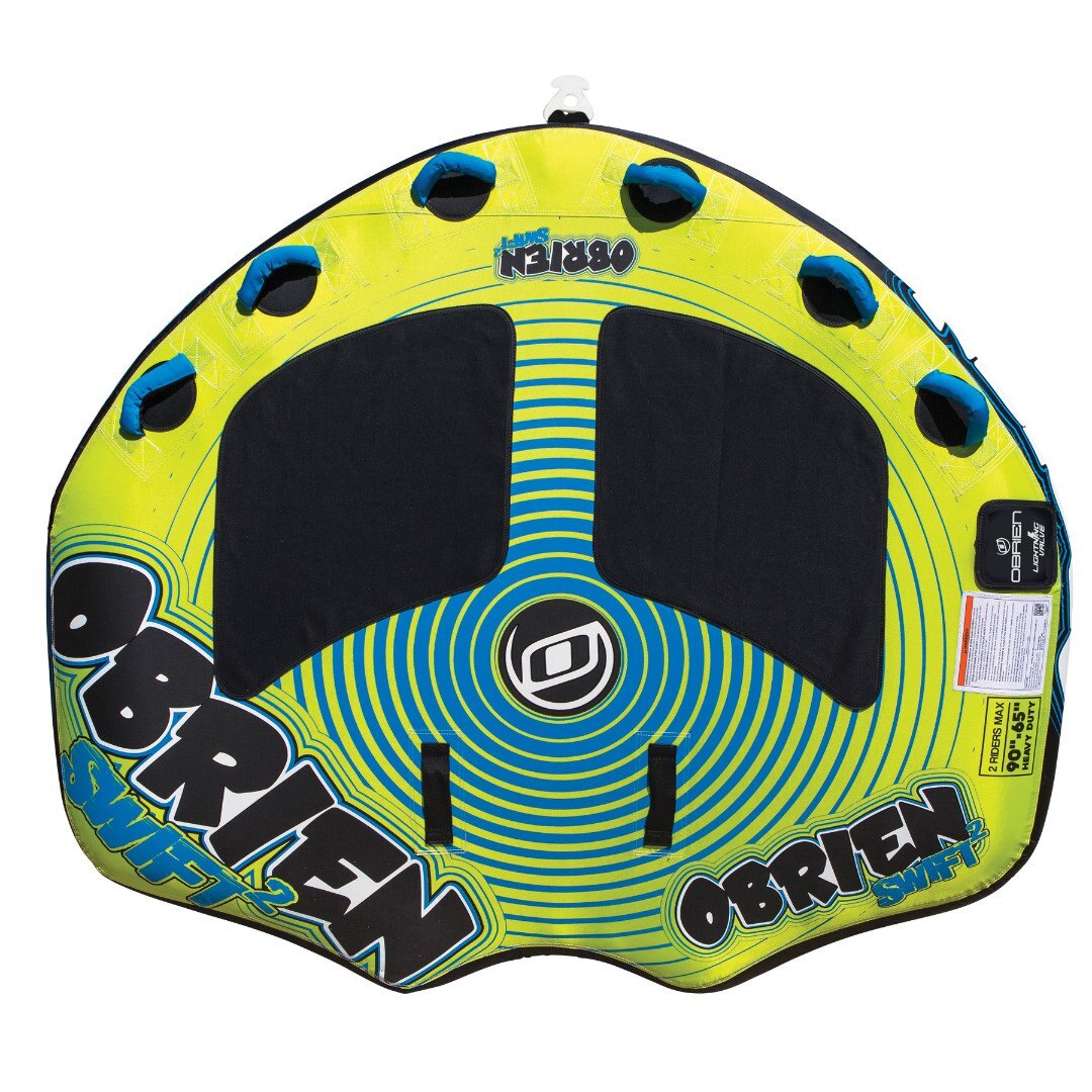 Swift 2 Deck Series The O’Brien Swift 2 is a fast and fun deck tube that skims across the water like no other. Designed for up to two riders, the Swift 2’s unique shape helps the tube carry speed while everyone holds on for an exhilarating ride. Its 6 handles with knuckle guards allow the riders to easily adjust their position and the two large EVA pads keep the deck soft underneath them as they move around. If a quick and lively ride for two is what you’re looking for, go with the O’Brien Swift 2. This OÌBrien towable boat tube has a capacity of 2 people. ONE YEAR LIMITED WARRANTY USE TENSILE STRENGTH TOW ROPE OF 2375 lbs | |||||||||||||||||||||||||||||||||||||||