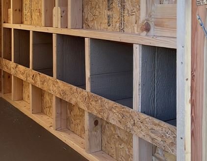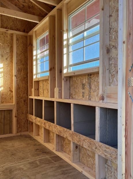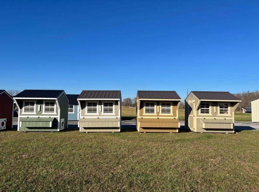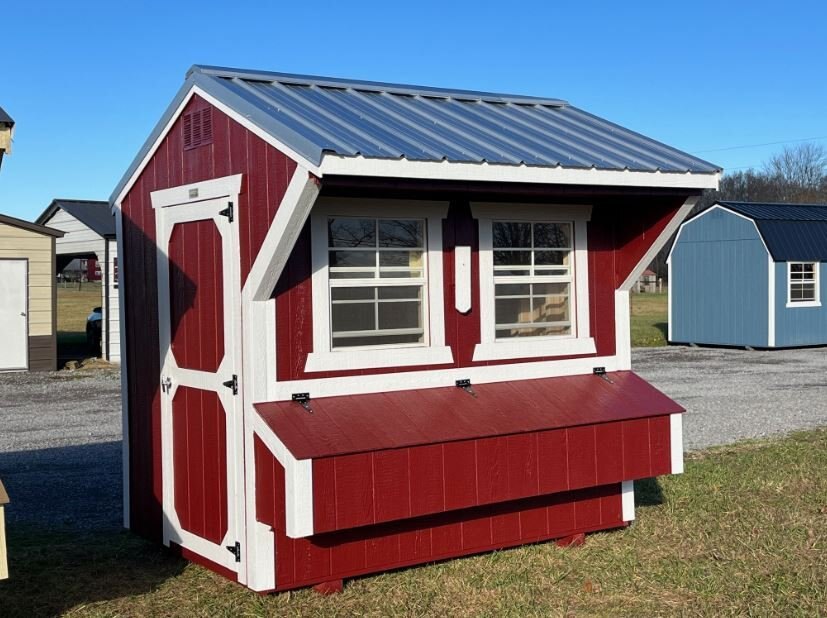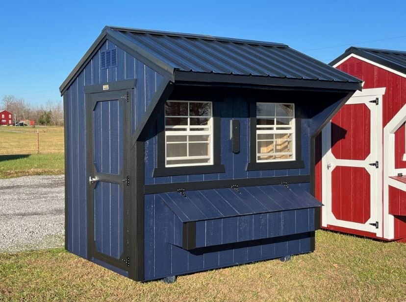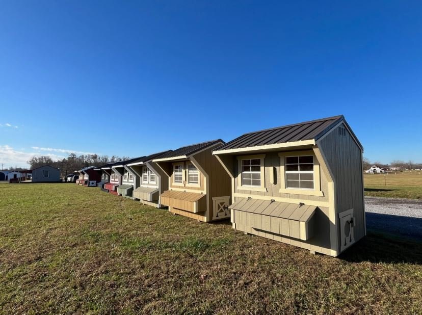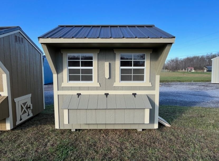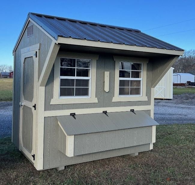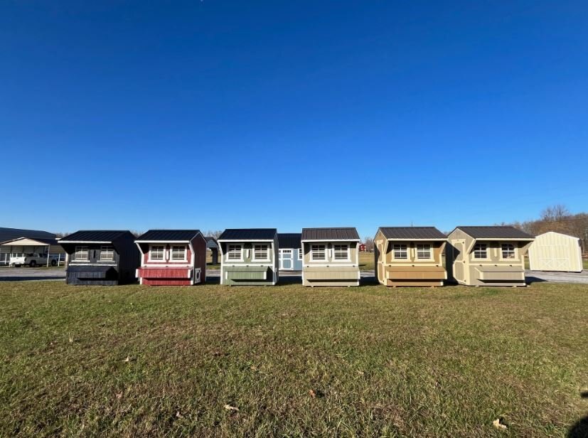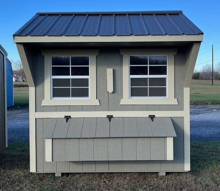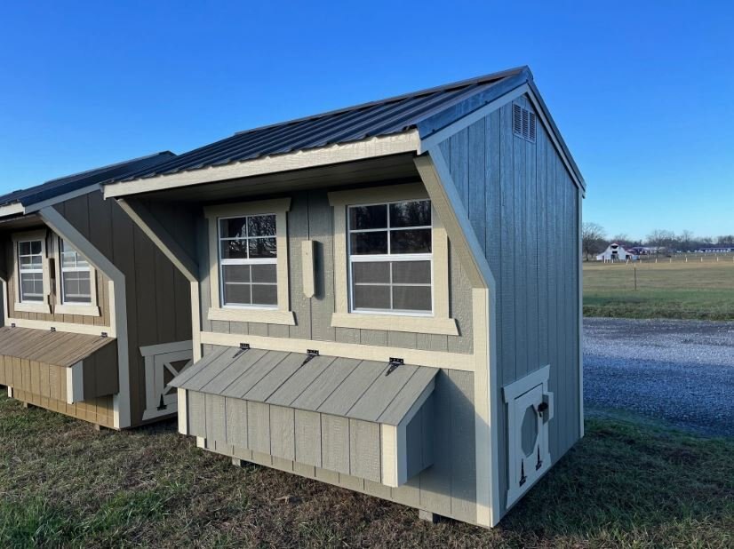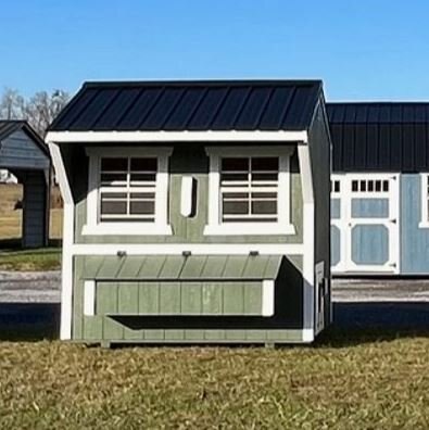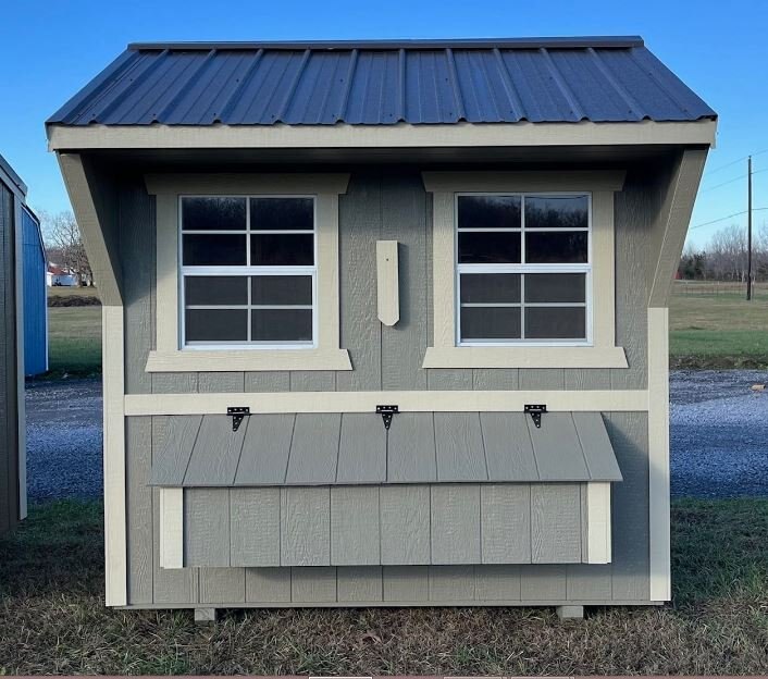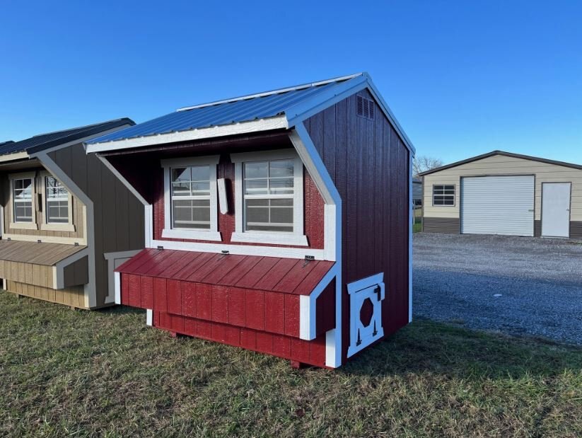 Old Hickory Chicken Coops are the ideal and affordable solution for raising chickens on a residential property. They include all the essentials needed to safely raise your chickens in a stress-free environment, protected from predators. It includes a 3ft barn door on the end, two 24in x 27in single pane windows to allow in fresh air, a roosting ladder, raised nesting boxes with an exterior hatch access, and a small chicken door that will allow the chickens to exit the coop to range in the area of your choosing. Chicken coops are available in 6ft or 8ft widths and in a few different lengths. |