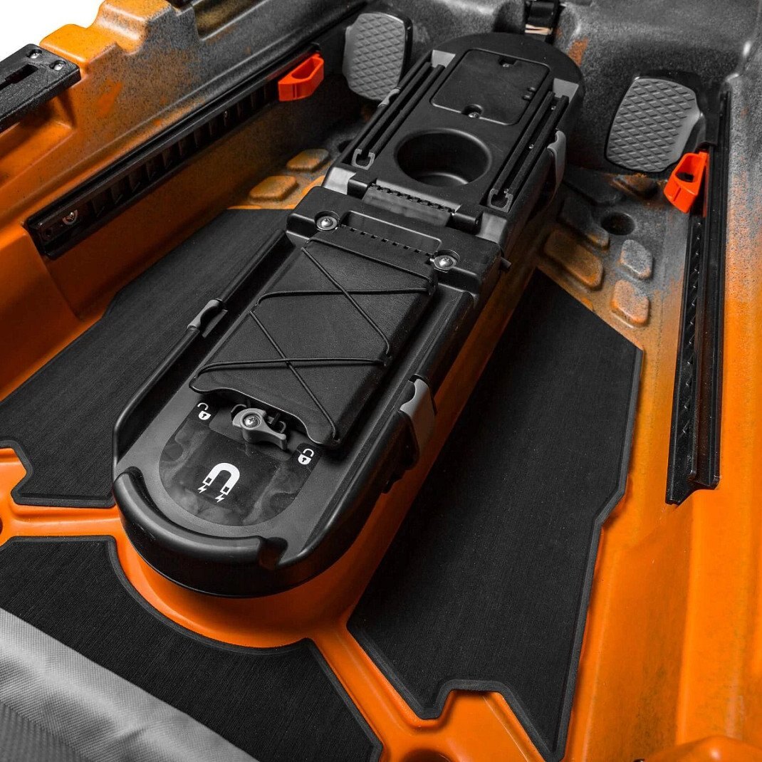 Center console mod pod is the "Swiss Army Knife" of consoles. Hinged lids open to two cavernous, removable containers, perfect for stashing tackle boxes or bait. Includes accessory tracks, a cup holder, splash proof storage for phone/keys and a magnetized hook and lure storage area