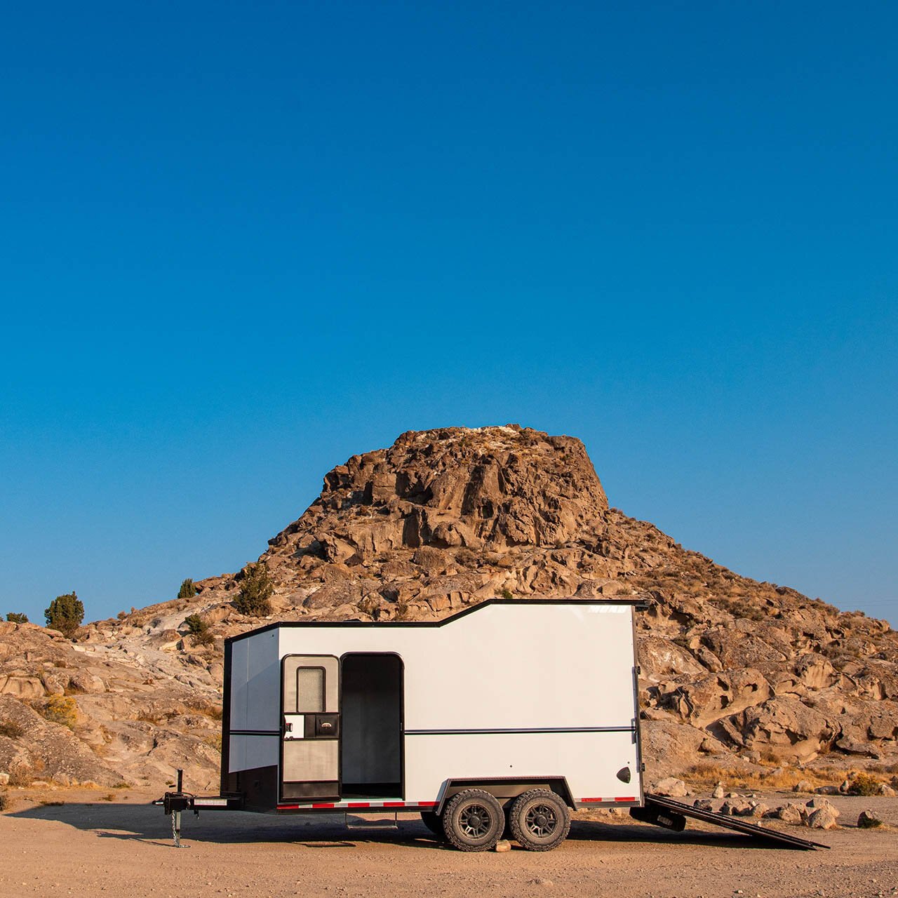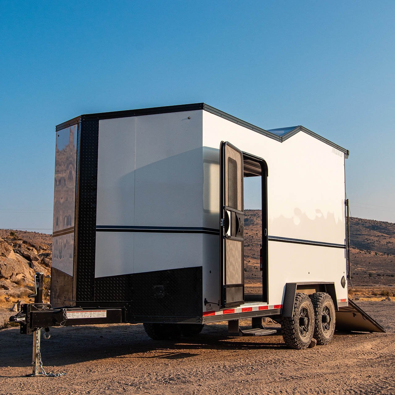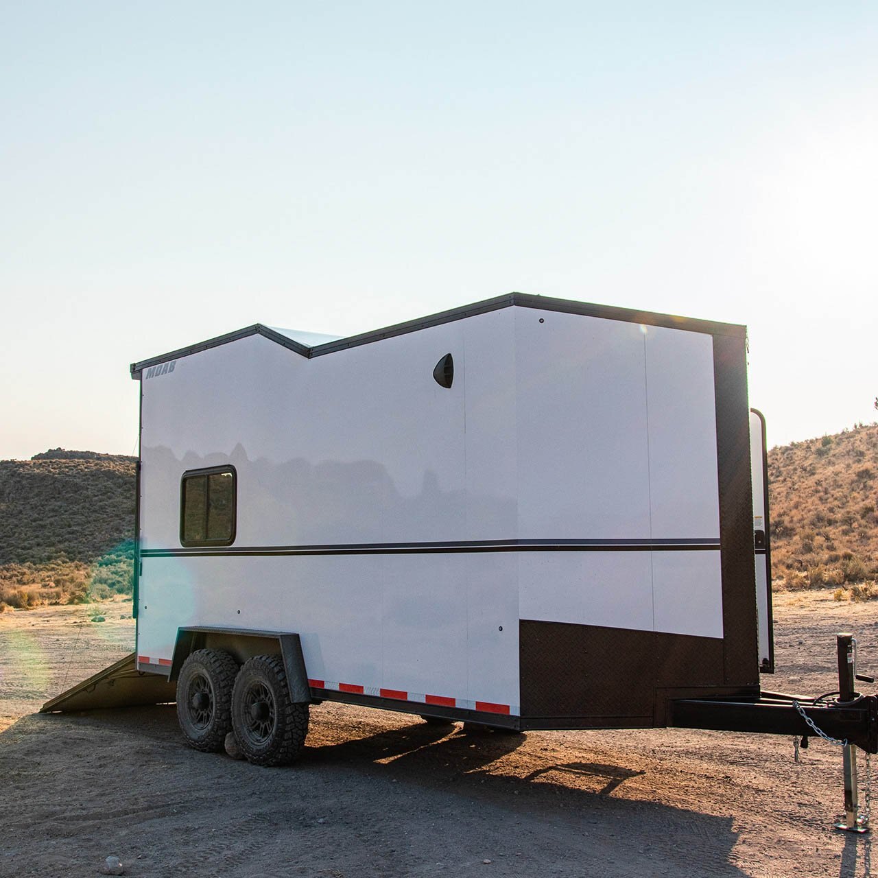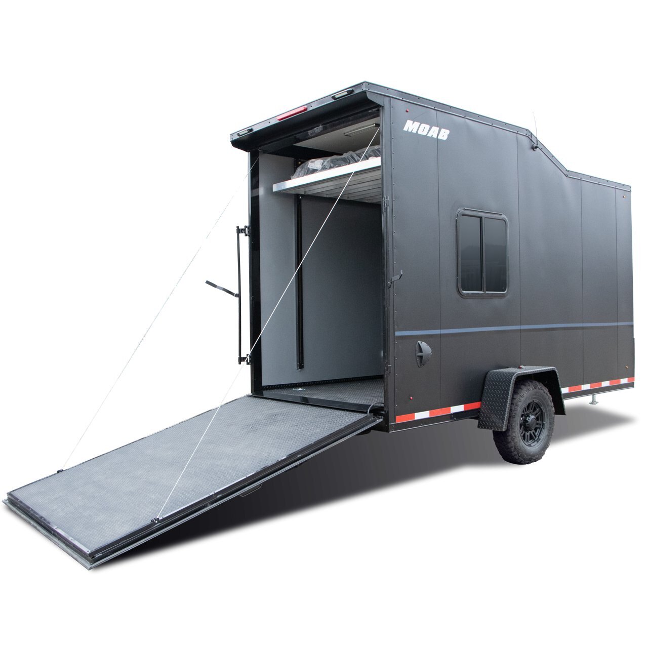 The MOAB is the ultimate off-road trailer. The MOAB UTV trailer is meant to be taken off-road and put in rugged terrains. This one-of-a-kind trailer has a unique design from top to bottom. The matte black exterior and spring roof immediately set it apart from everyday trailers. And the list of standard features will have you thinking you’re getting a special-order unit! From Dick Cepek Wheels and fold-down stabilizer jacks, to LED lighting, ATP fenders/V-nose, 5,000lb. D-rings, a spare tire and more, the MOAB offers a list of impressive conveniences.