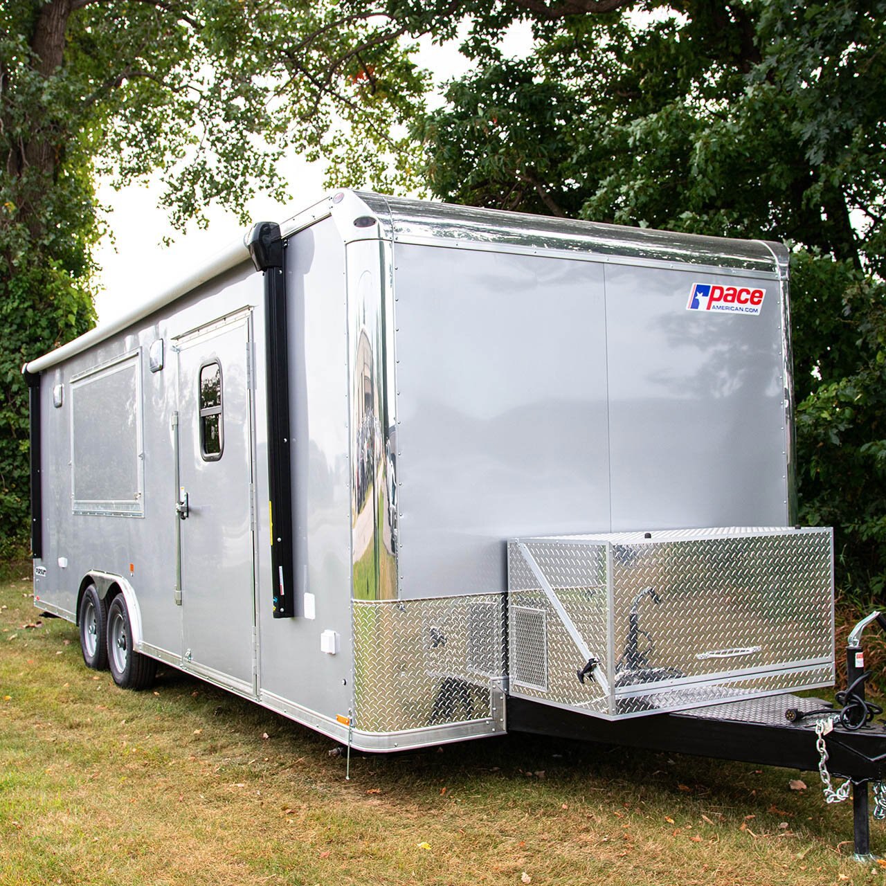 THE PURSUIT CAN HANDLE ANY PASSION With electric brakes, LED taillights and tube main frame construction, you can be sure your valuable cargo will arrive safely. And if this isn’t enough, consider customizing! This is a perfect unit to have some fun with and look at making upgrades to. Popular options include spar tires, aluminum rims, additional D-rings, adding an escape door or wall/floor e-tracks and more. Find your local Pace American dealer and hit the track! |