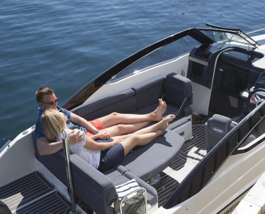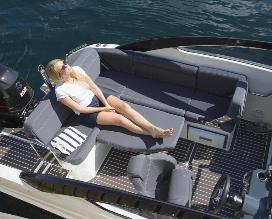 The Parker 630 Day Cruiser is the new addition to Parker’s Cruiser range.A proven design inherited from the well-known Parker 630 Bowrider & Sport model hull guarantees excellent marine quality. This model stands out from its counterparts with its forward cabin with a bed for 2 people and optional marine toilet. in the cockpit, An L-shaped bench seat with a central table turns into a sunbathing area, a system allows the backrest of the rear seat to be tilted, to take full advantage of the bathing beaches, when swimming or when a buoy or a skier is pulled. .With a 150 HP engine, you reach a dizzying speed of 41 knots” |