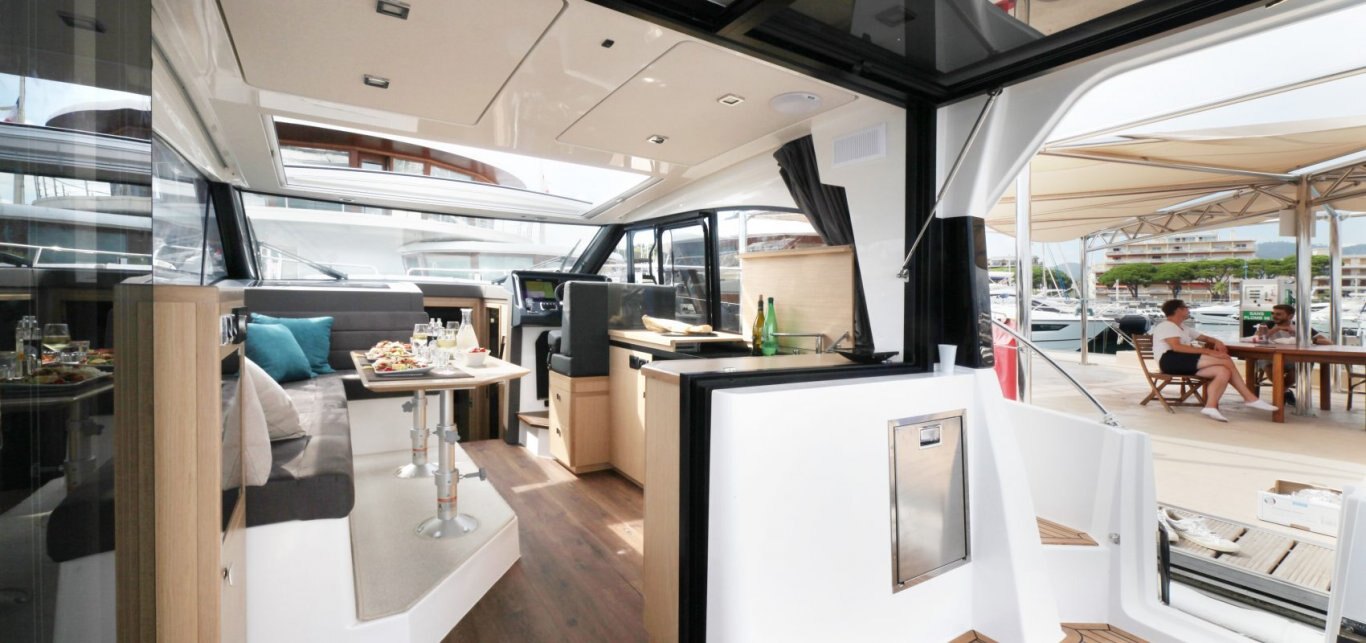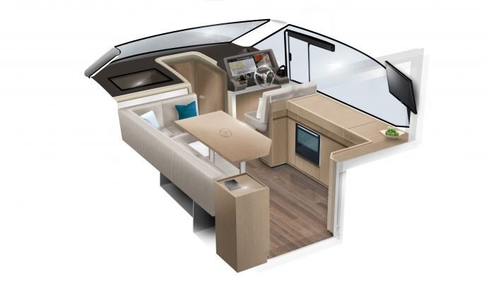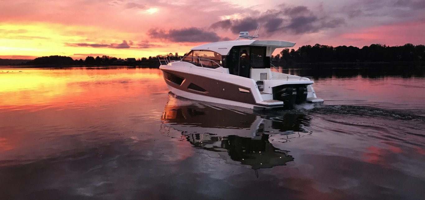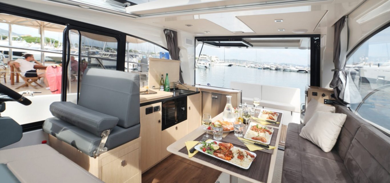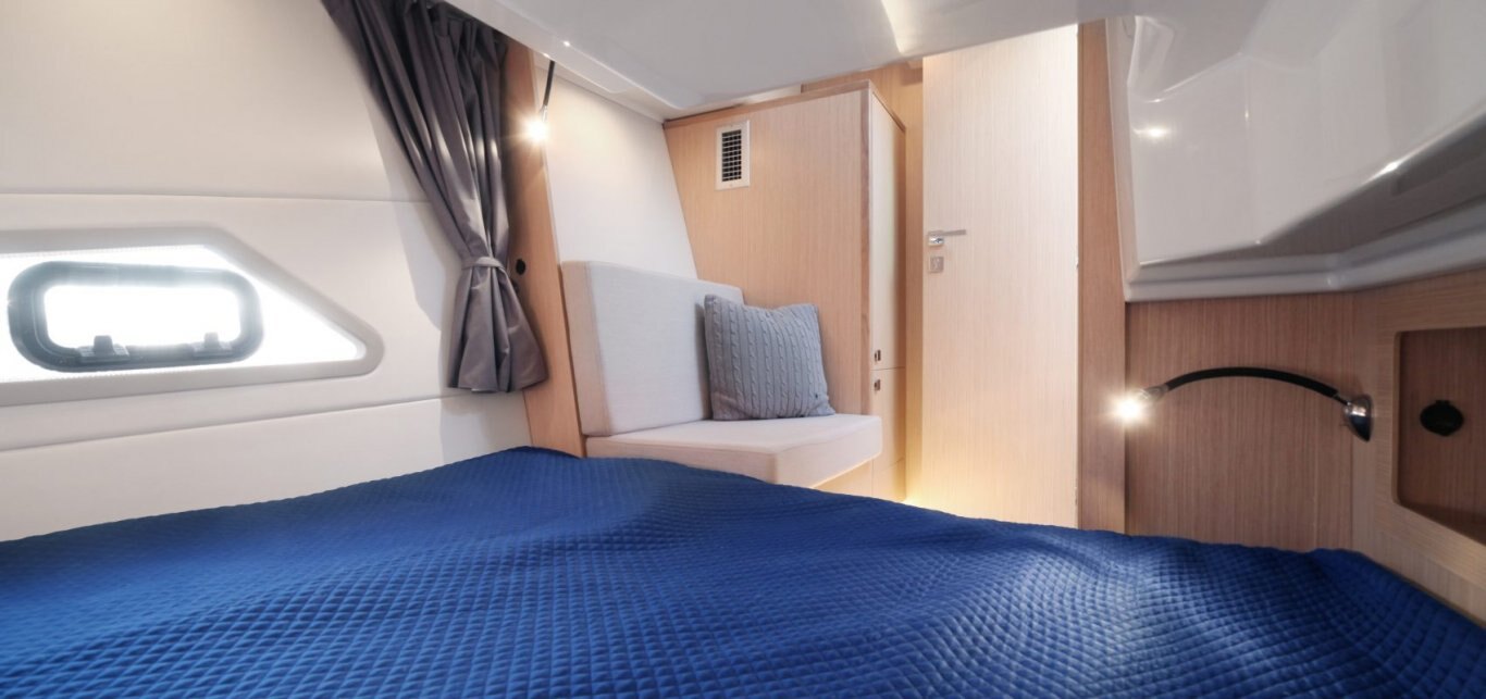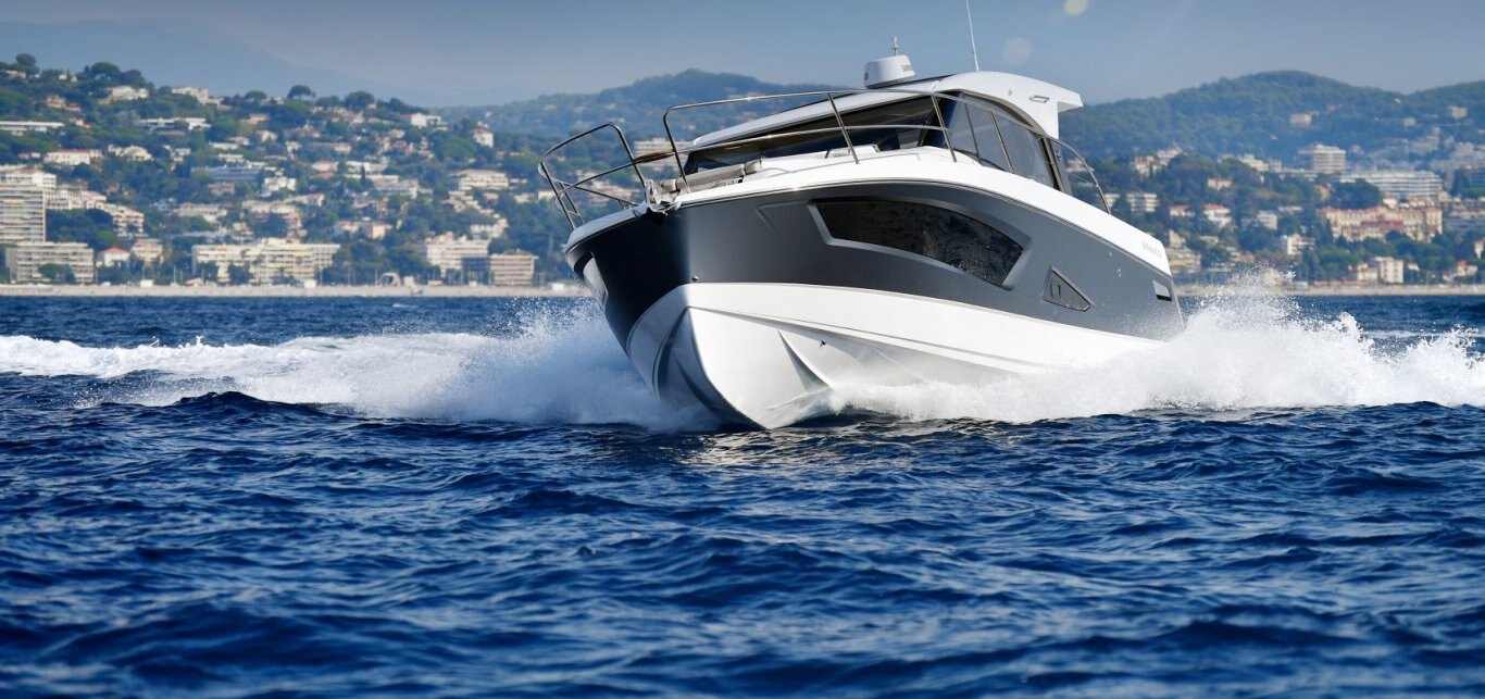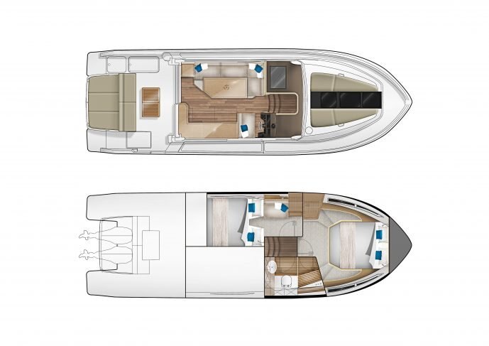 The Parker Monaco is the first of a new series of sporty outboard boats from PARKER Boats in collaboration with Tony Castro Design. This design combines the spacious layout of a cruiser with the latest outboard designs. These outboards are now very efficient and great value-for-money delivering performance and light weight compared with inboard engines. Raising the outboards allows the props and legs to be clear of the water avoiding the need to antifoul them and spending less time immersed in salt water. This should help enormously with lower cost maintenance. A novel and uniquely designed sunbed covers the outboards motors, which lowers the noise levels for the passengers. The seat/sunbed can slide aft increasing the cockpit area, and forward when you need to tilt the engines up. The interior offers an equivalent layout to any classic inboard boat and arguably better in many respects. It has 2 good cabins and a bathroom with separate full size shower. On the main deck a large seating area and Galley with a drinks cooler fridge accessible from the cockpit . Lighting plays an important part in creating the right ambiance to make life easy and enjoyable. The boat is equipped with both a glass sliding roof and another sliding canvas skylight over the cockpit area. Other notable features are the helm door, usually seen on bigger boats and the rare topside door for easy boarding onto the boat from a marina berth. A wide range of outboard engines is available, typically a pair of 150HP or 300Hp for sparkling speeds and a comprehensive list of additional equipment. Overall a very sleek modern design, practical and functional for a price that will surprise and delight you. |