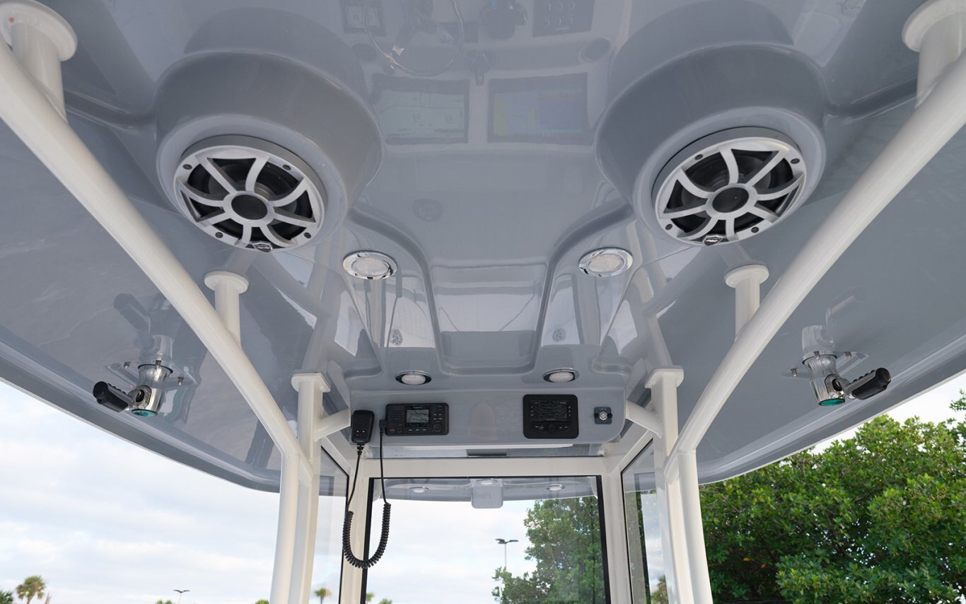 Fiberglass Hard-Top, White Powder Coated D-Channel T-Top Frame w/ 4-Rod Rocket Launcher, Connected Leaning Post Support Arms w/ 5 additional rod holders, Electronics Box, Integrated LED Spreader Lights (1 Fwd, 2 Aft), Speaker Pods (4), LED Courtesy Lights (3)
