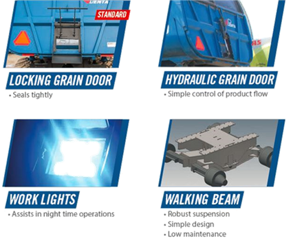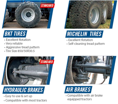 Superior flotation and ease of transport are strong features of the dump trailer product line. All models feature 800/45R26.5 tires - providing flotation in challenging field conditions, and minimizing the horsepower required to pull each unit.