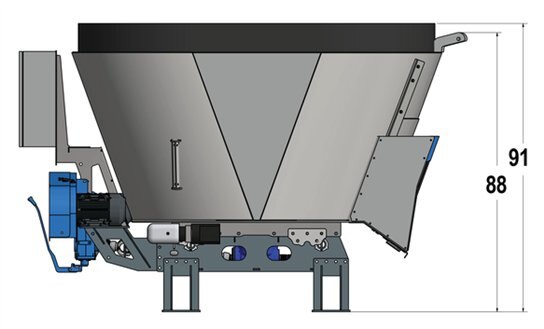 SINGLE AUGER STATIONARY 2030Penta Stationary Vertical Mixers are compact and convenient machines with a high capacity and low power consumption. Stationary Mixers offer the possibility to use more economical feed boxes with less horsepower to distribute the feed. The mixers run at a reduced constant RPM as opposed to mobile mixers, and full clean out can be arranged through a variable drive and gearbox. All mixers are built on a subframe and supports can be ordered to put the machine at the desired height. The machine is operated by a frequency changer which makes sure that the machine starts slowly and without any increase in power. The frequency changer also enables acceleration as required. Contact Penta for door location and HP requirements. |