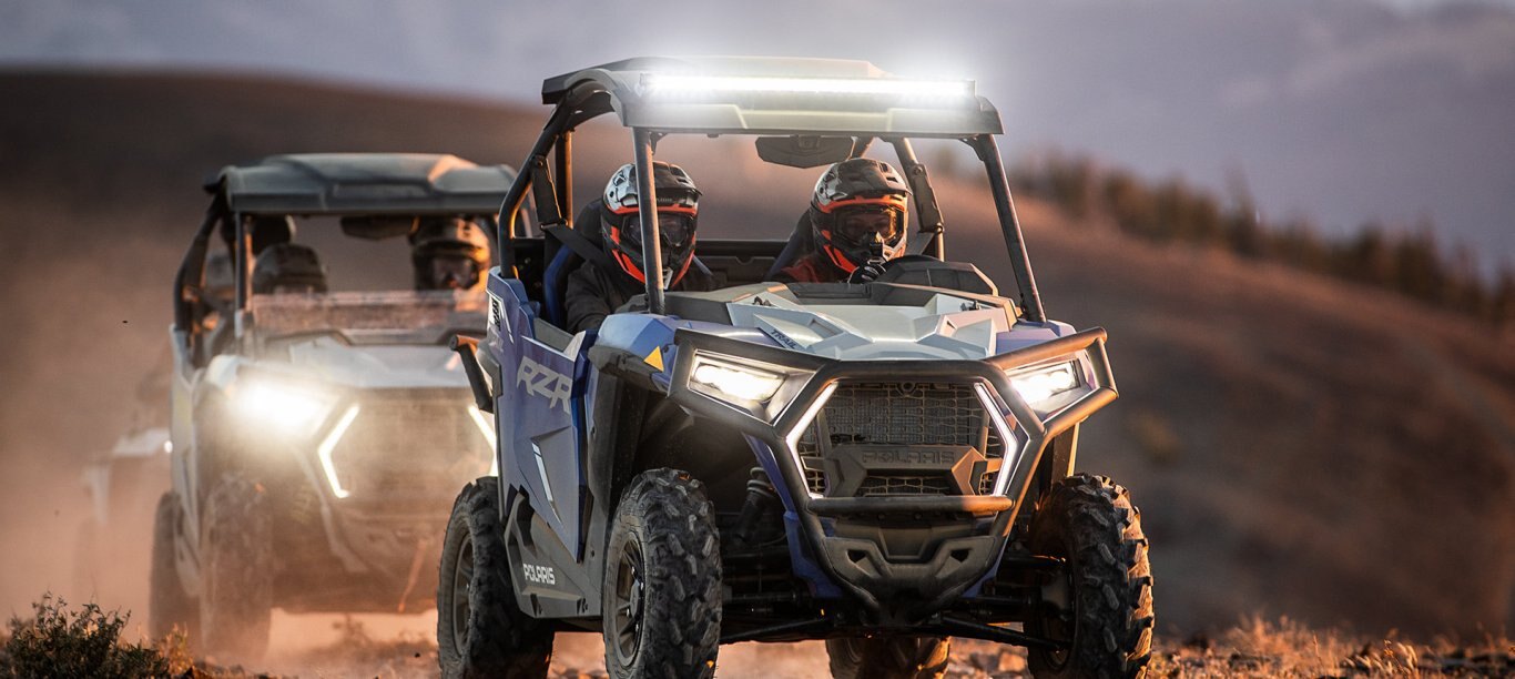 VISIBILITY OF LED LIGHTING Polaris RZR Trail  racing on a trail road in the sunset
