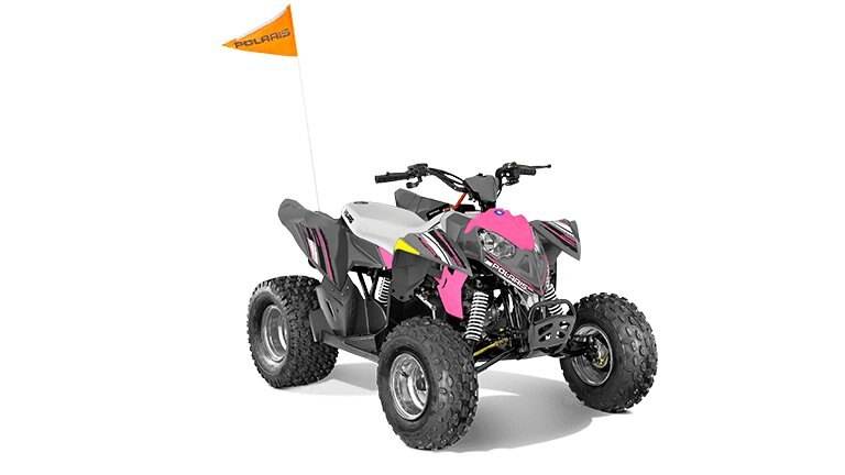 The Outlaw 110 comes standard with one Polaris youth helmet, safety tether, daytime running lights, safety whip flag and speed limiting adjuster. |
