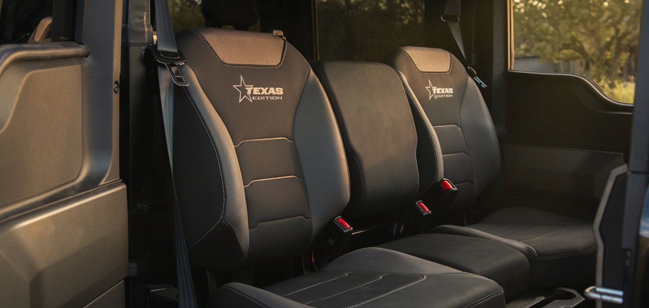 6-person, dual-row, superior contoured, bolstered bench seats with 3-point harness, heated front row seats, adjustable driver seat, and flip-down arm rest