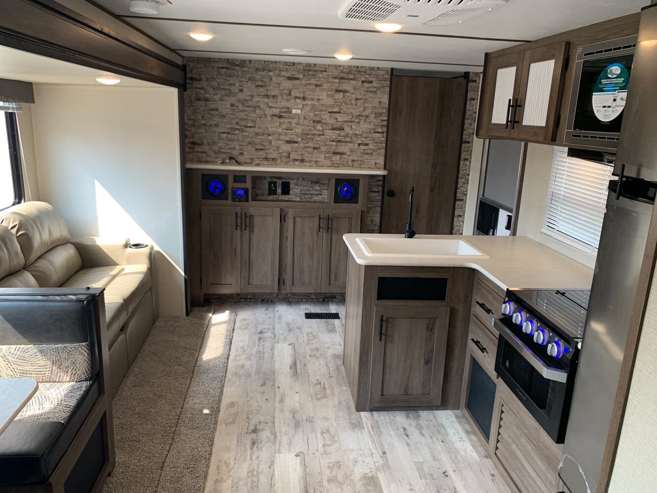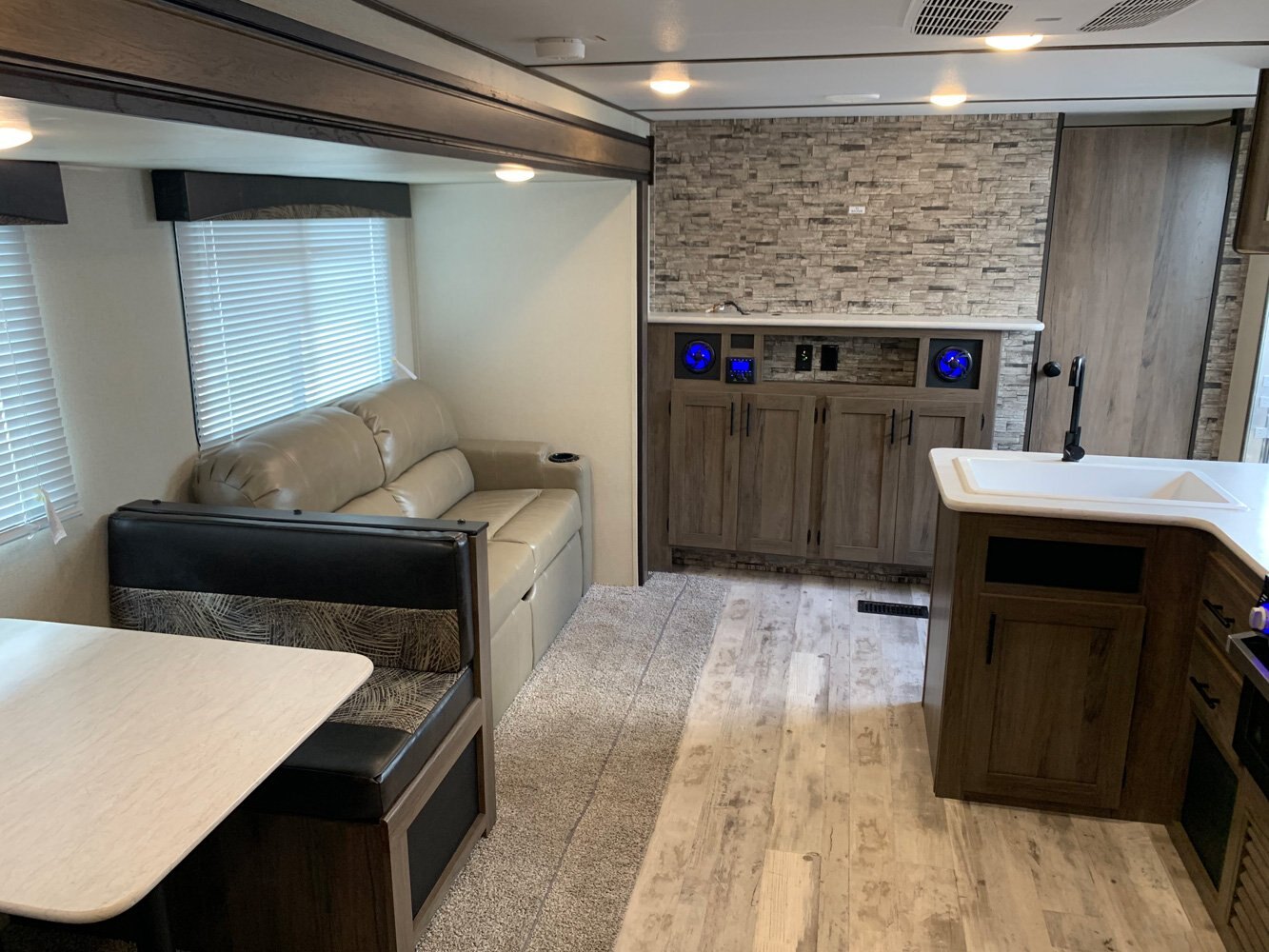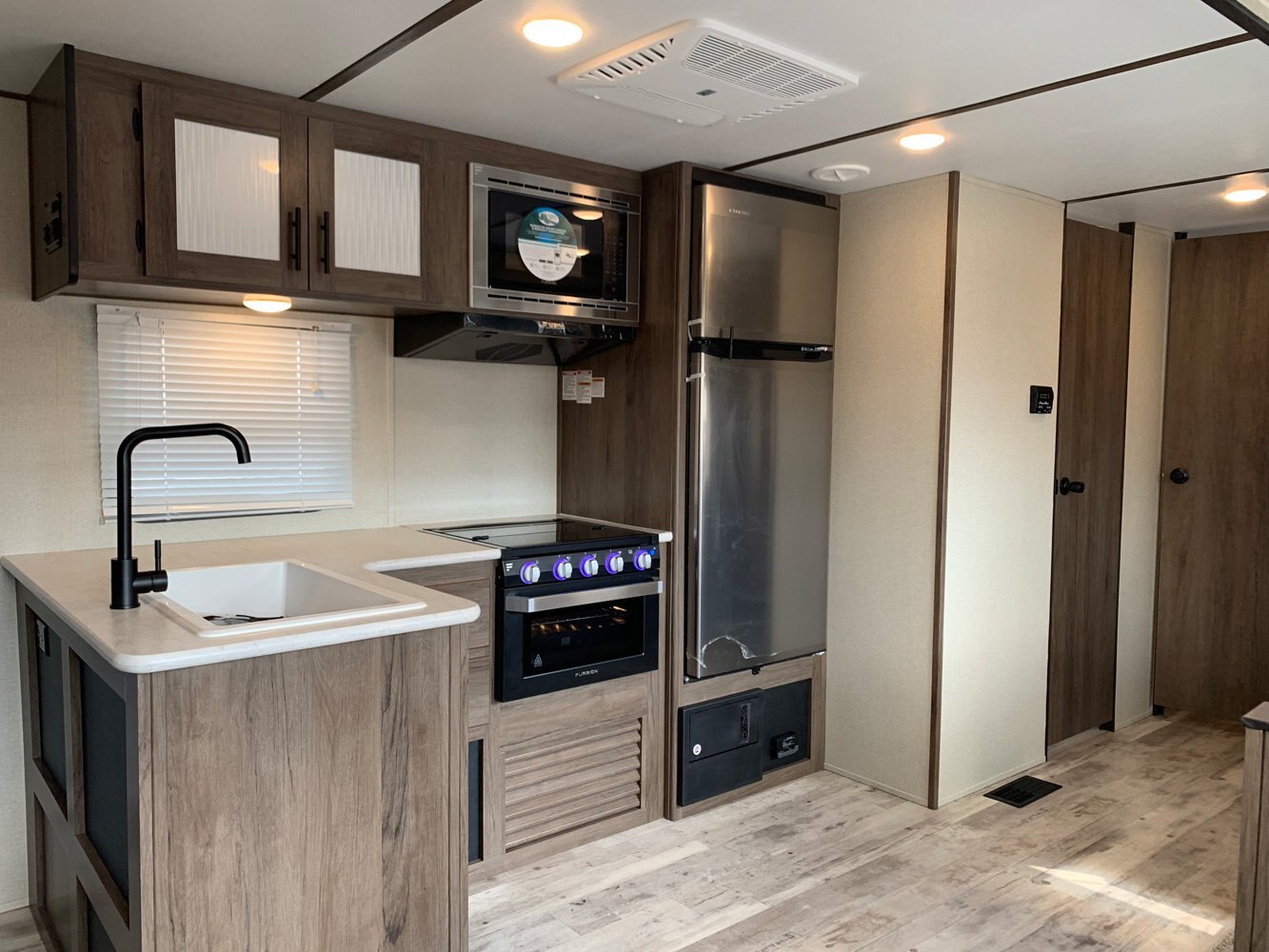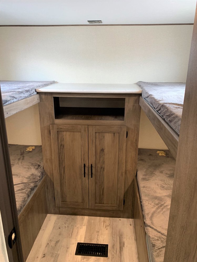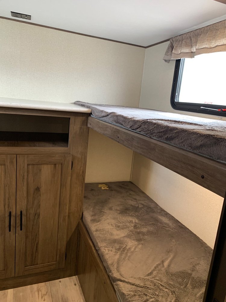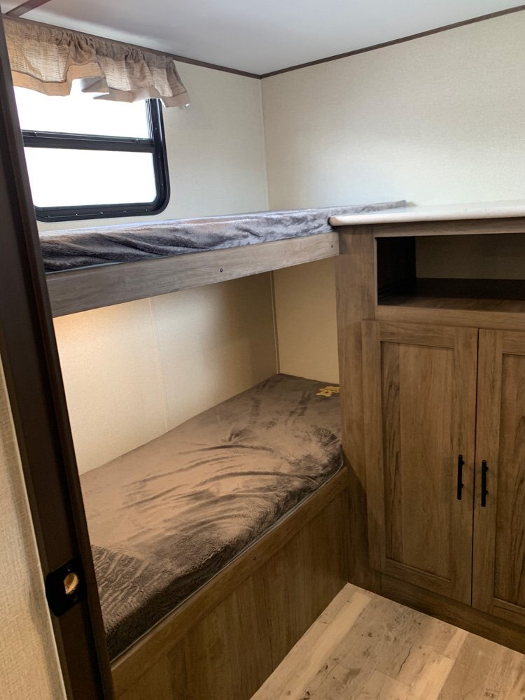 | "The 28QBSLE is a quad bunk model capable of comfortably sleeping eight people comfortably. The main front bedroom offers a full walk around bed, nightstands with 110 outlets on either side, and overhead storage complete with shirt closets. The focal point of the living space is the extra large, stone pattern entertainment center, located near the sofa. The large 12 volt refrigerator, deep single basin sink, spacious pantry, and dinette in the slide can all be found in the kitchen. |