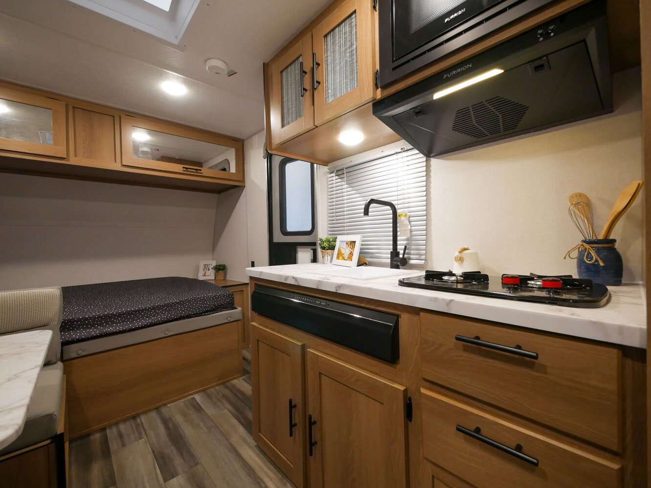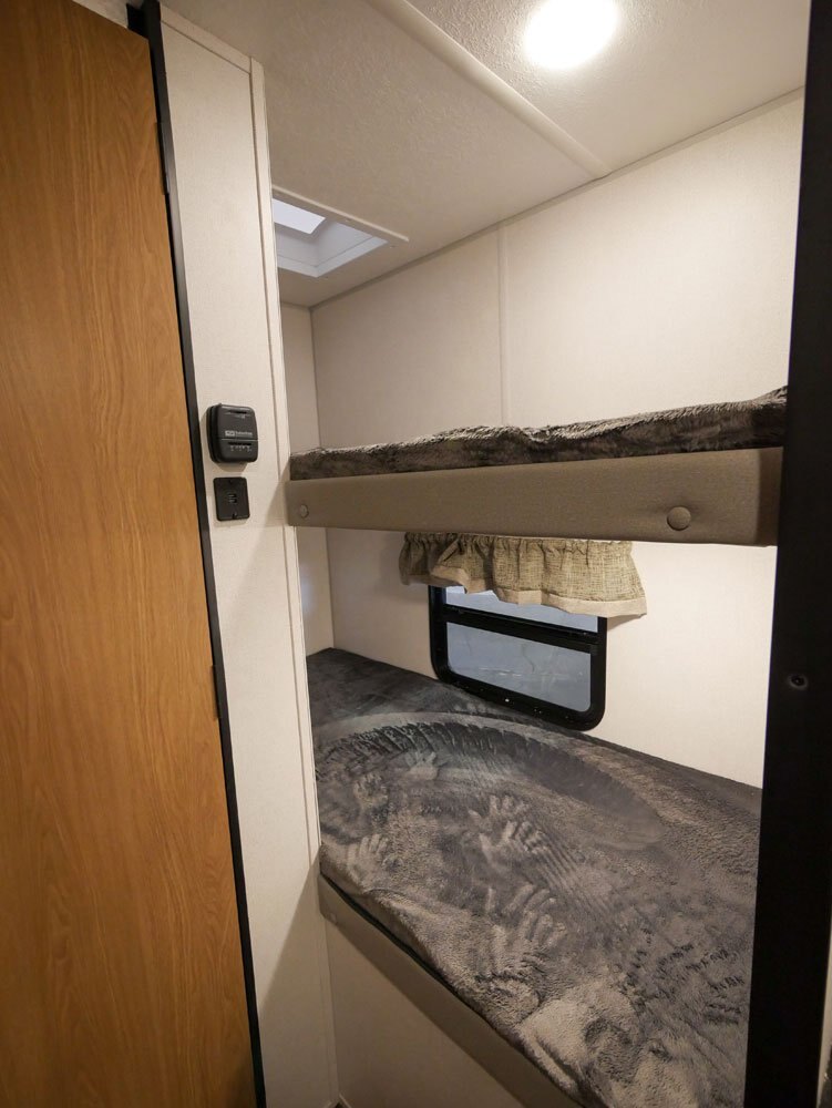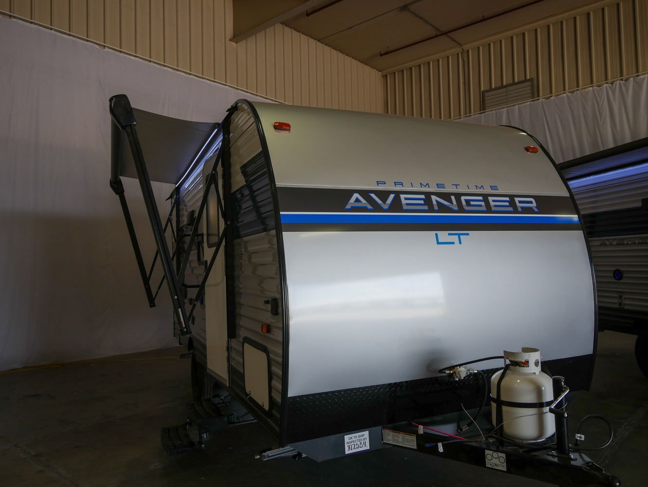 | The Avenger 16BH is a compact, lightweight bunkhouse model that's perfect for families! There's a front main bed for mom and dad, with a set of bunk beds in the rear for the kids. The kitchen provides a two burner cooktop, refrigerator, microwave, and range hood, with glass fronted overhead cabinets for storage. |