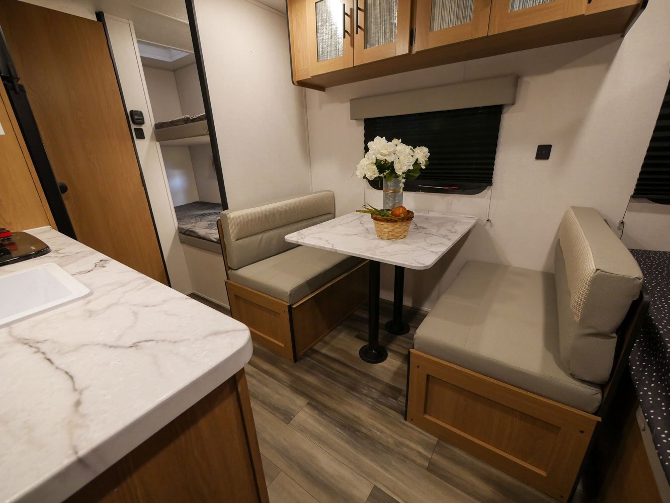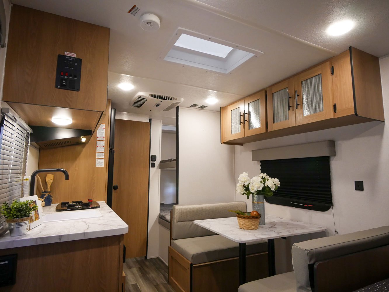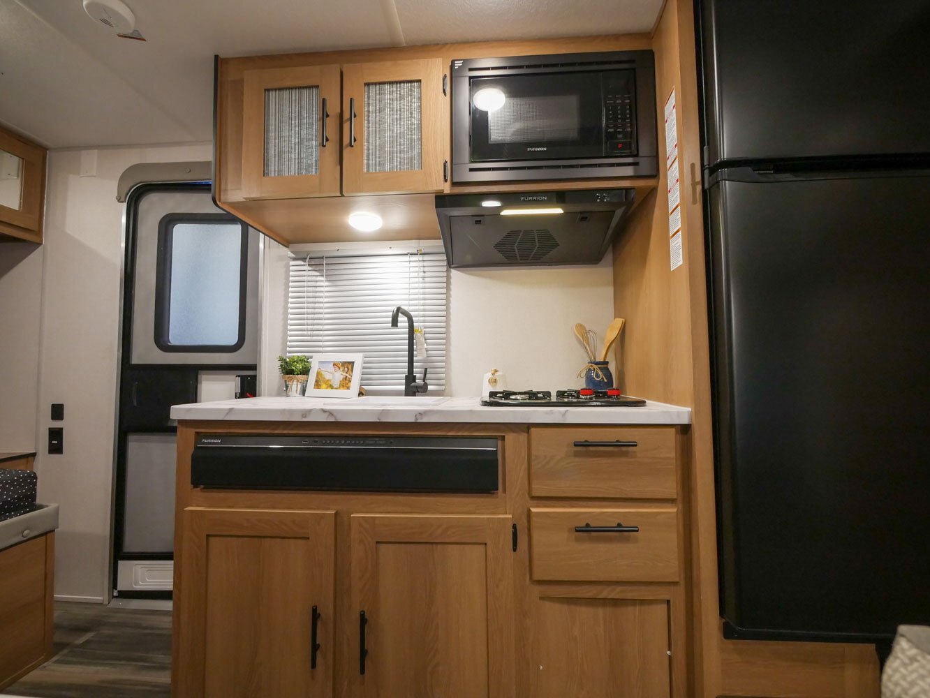 | The Avenger 16BH is a compact, lightweight bunkhouse model that's perfect for families! There's a front main bed for mom and dad, with a set of bunk beds in the rear for the kids. The kitchen provides a two burner cooktop, refrigerator, microwave, and range hood, with glass fronted overhead cabinets for storage. |