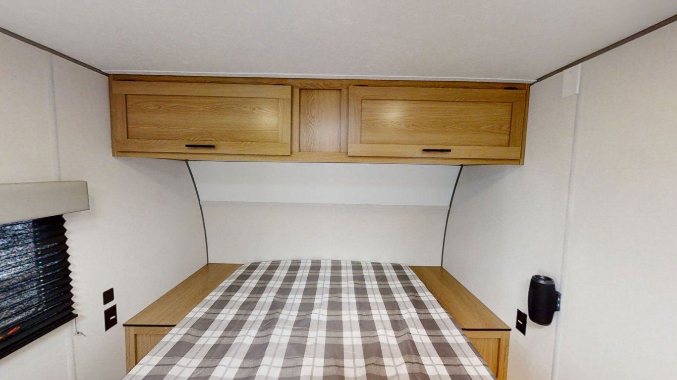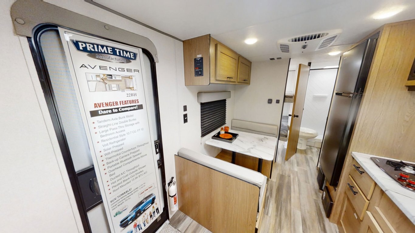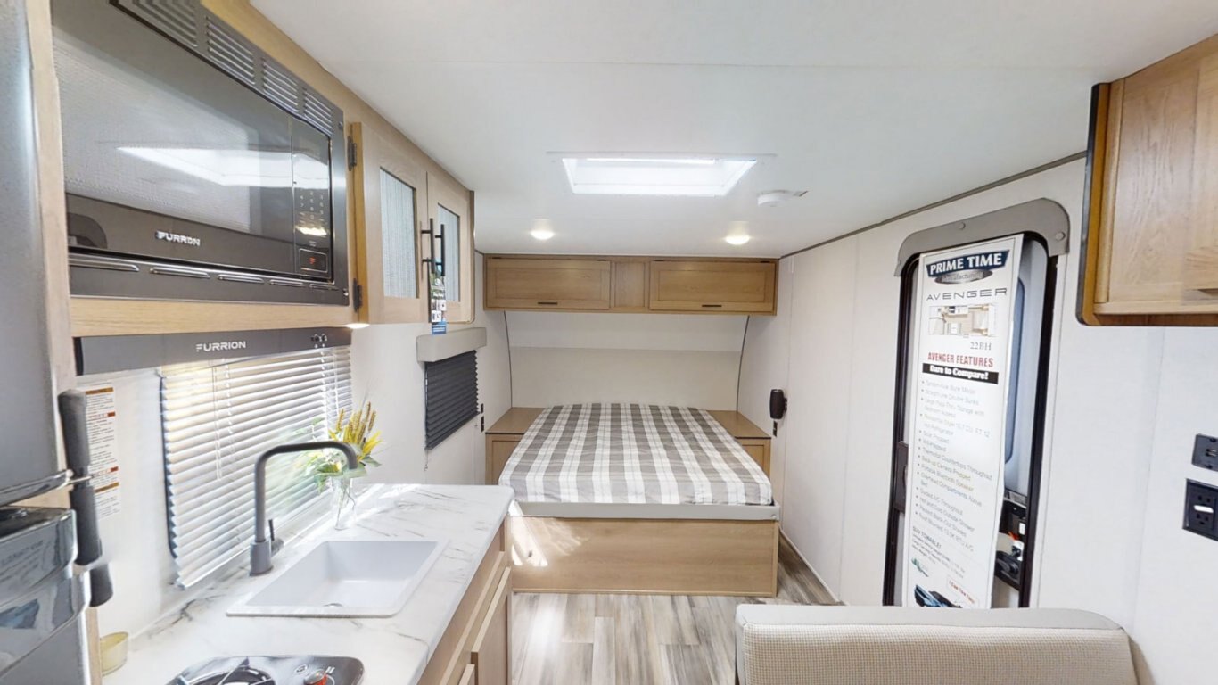 | The Avenger 22BH is extremely popular, and it's easy to see why! This bunkhouse model weighs less than 4,000 lbs for easy towability. There's a walkaround queen bed up front with cabinets on either side and overhead. The kitchen is compact but still features a two-burner cooktop, microwave, refrigerator, and pantry. The bathroom is fully equipped with commode, sink, and shower. The bunk room features two DOUBLE bunks so you can stretch out and get a good night's sleep. |