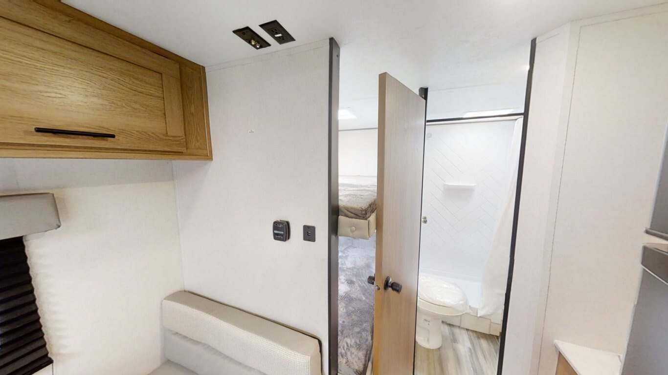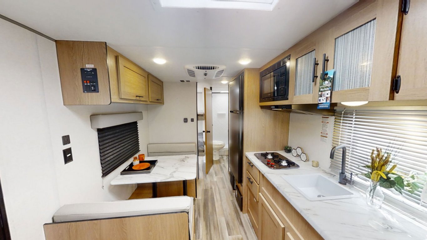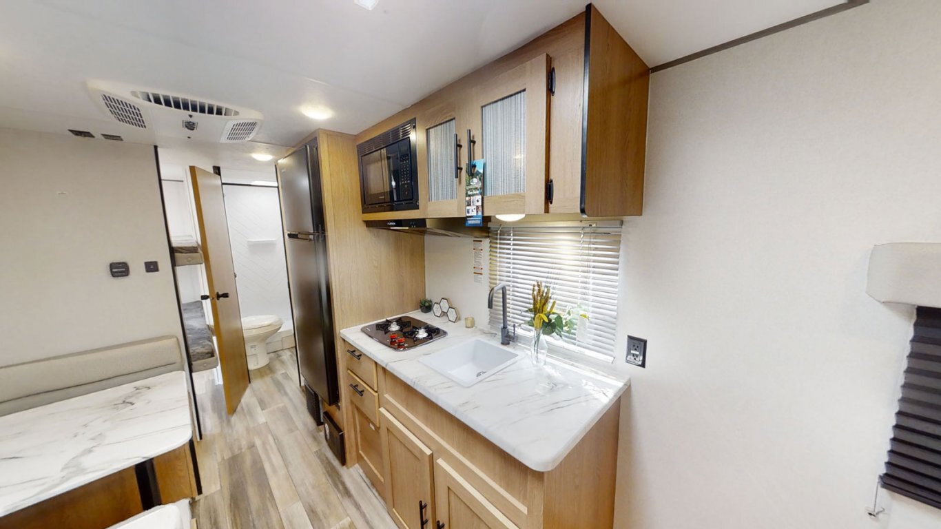 | The Avenger 22BH is extremely popular, and it's easy to see why! This bunkhouse model weighs less than 4,000 lbs for easy towability. There's a walkaround queen bed up front with cabinets on either side and overhead. The kitchen is compact but still features a two-burner cooktop, microwave, refrigerator, and pantry. The bathroom is fully equipped with commode, sink, and shower. The bunk room features two DOUBLE bunks so you can stretch out and get a good night's sleep. |