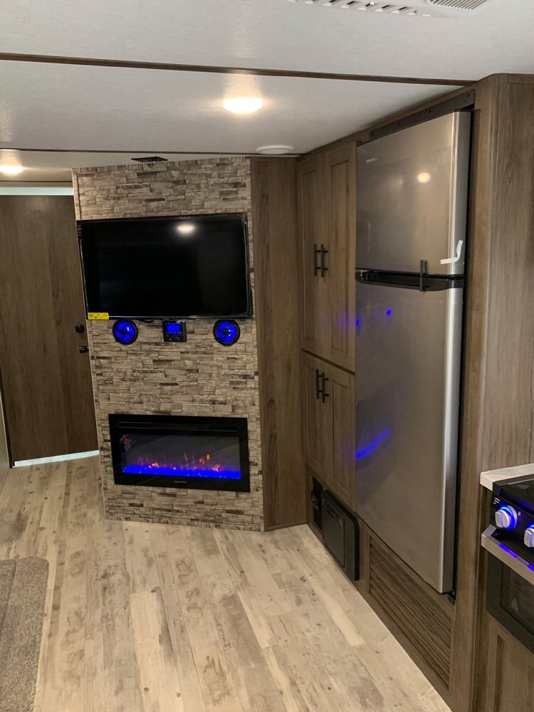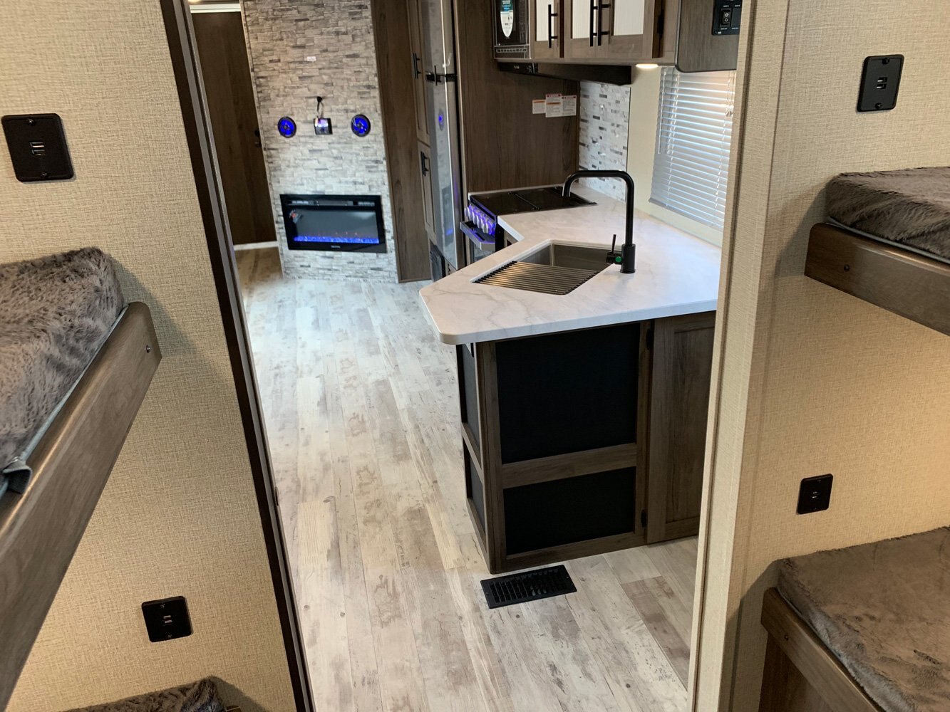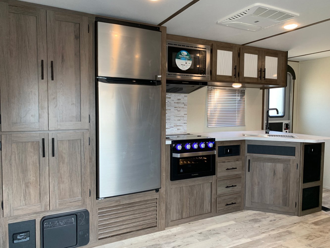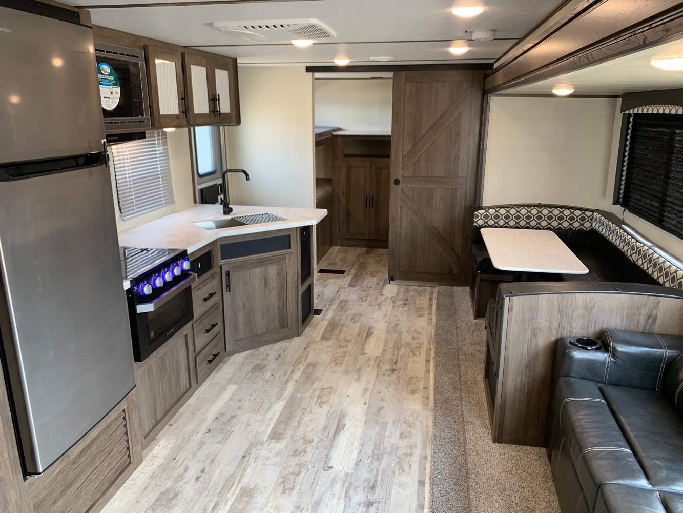 | The Avenger 29QBS features a front master bedroom with walkaround queen bed and wardrobe cabinets. The main living area is open and stylish, with a faux rock accent wall and a rear sliding barn door. The entertainment center features a TV, fireplace, and LED lit audio system. A large slideout contains the sofa and U-dinette. The kitchen is fully equipped for meals on the go with a stovetop and oven, oversized stainless steel farmhouse sink, range hood, refrigerator, and residential microwave. |