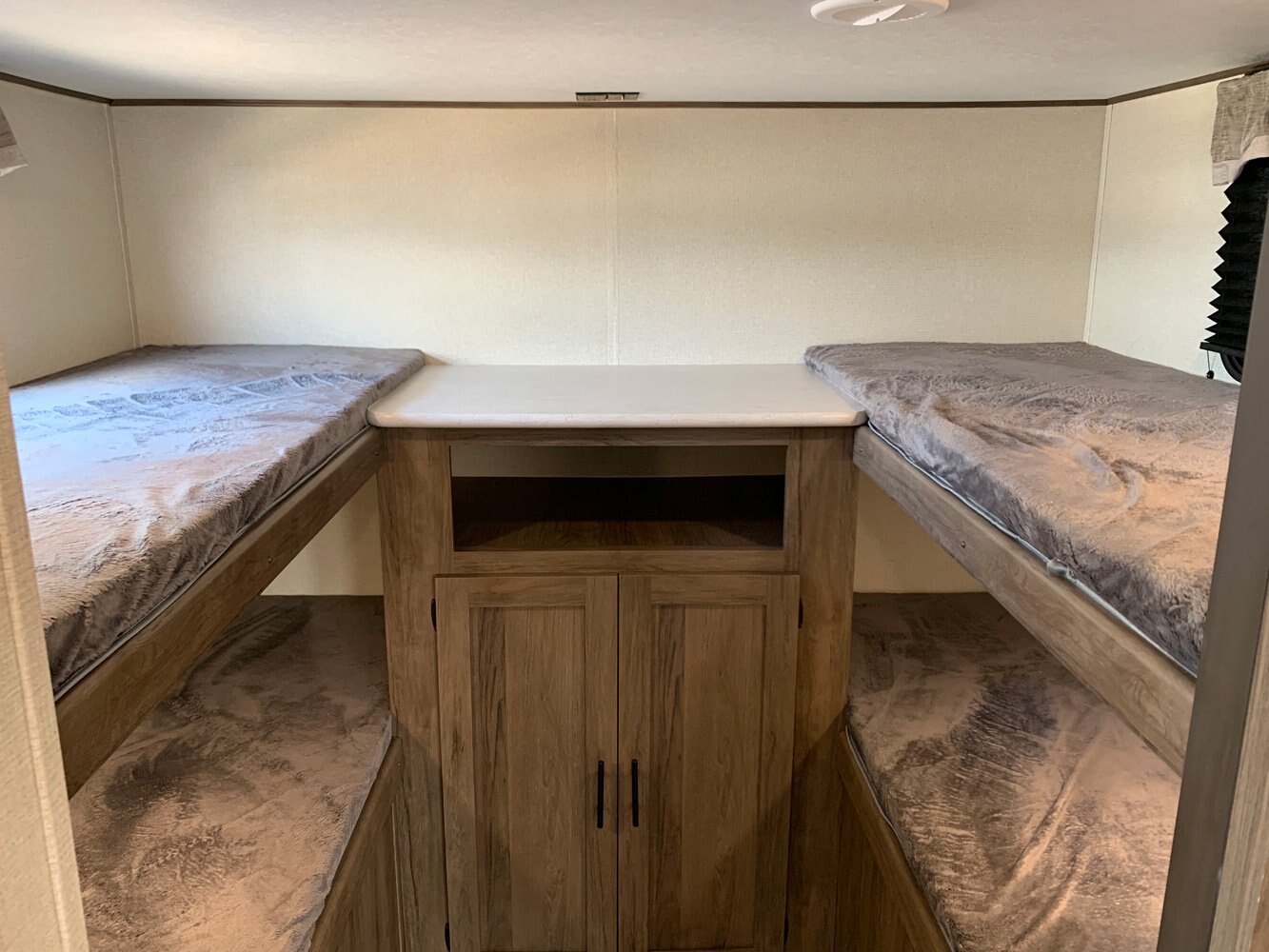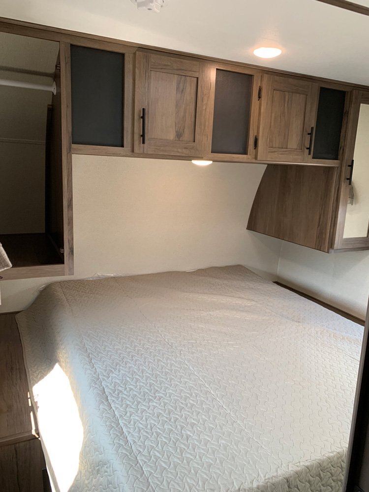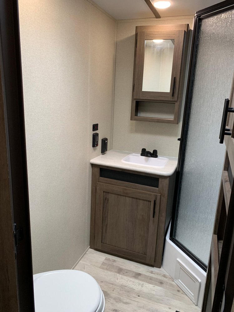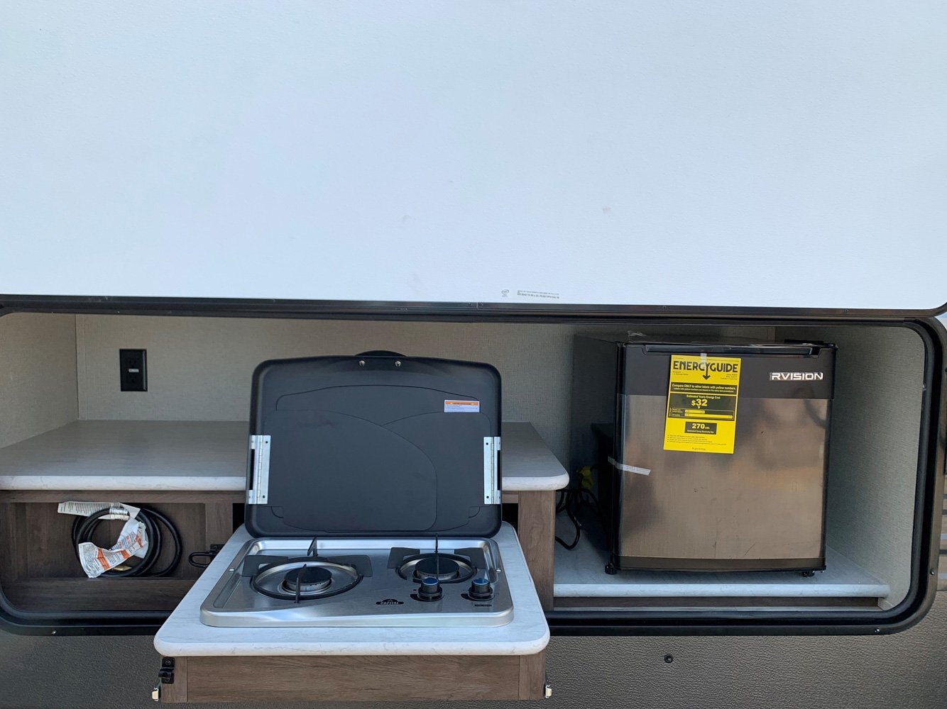 | The Avenger 29QBS features a front master bedroom with walkaround queen bed and wardrobe cabinets. The main living area is open and stylish, with a faux rock accent wall and a rear sliding barn door. The entertainment center features a TV, fireplace, and LED lit audio system. A large slideout contains the sofa and U-dinette. The kitchen is fully equipped for meals on the go with a stovetop and oven, oversized stainless steel farmhouse sink, range hood, refrigerator, and residential microwave. |