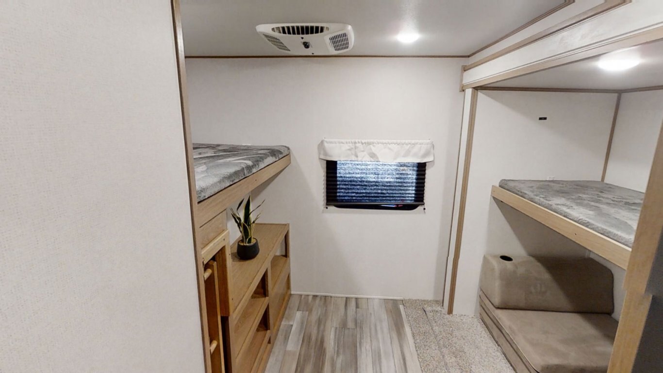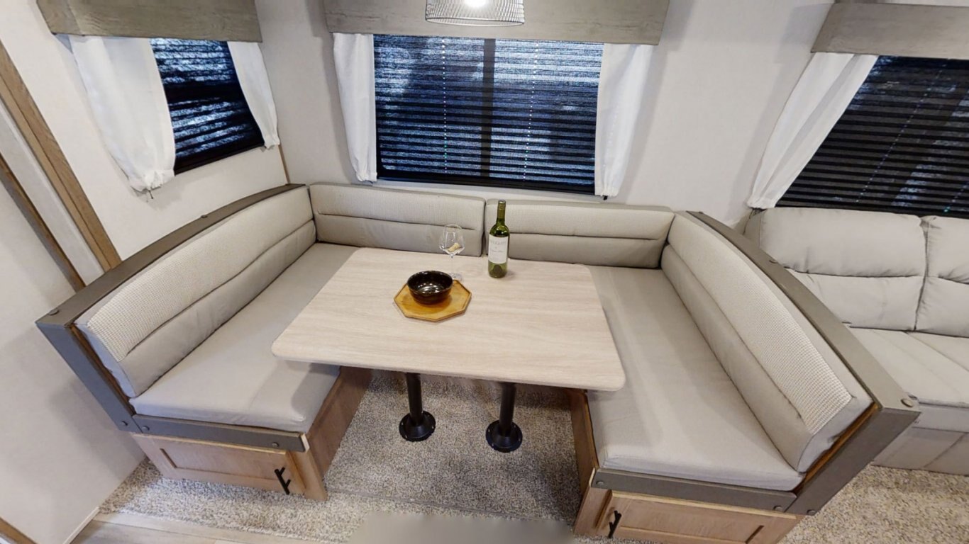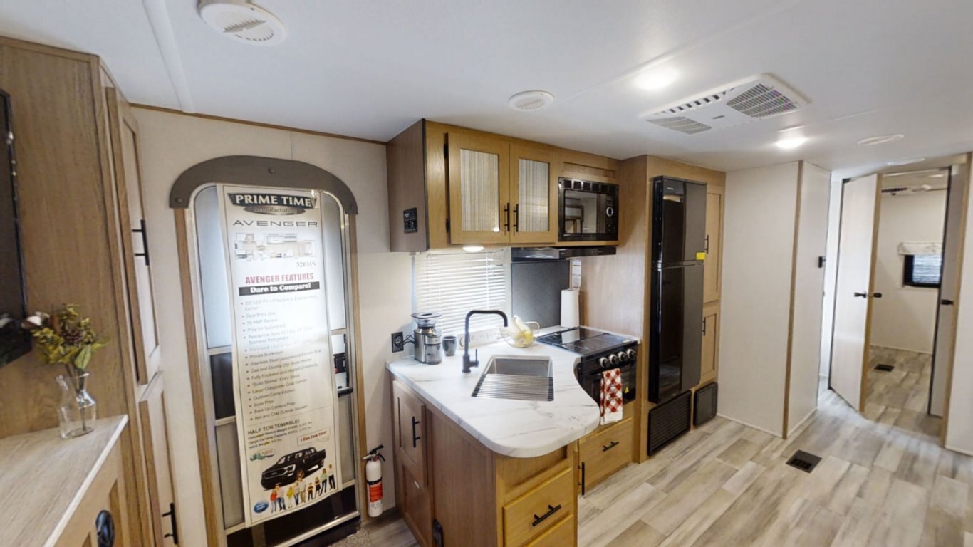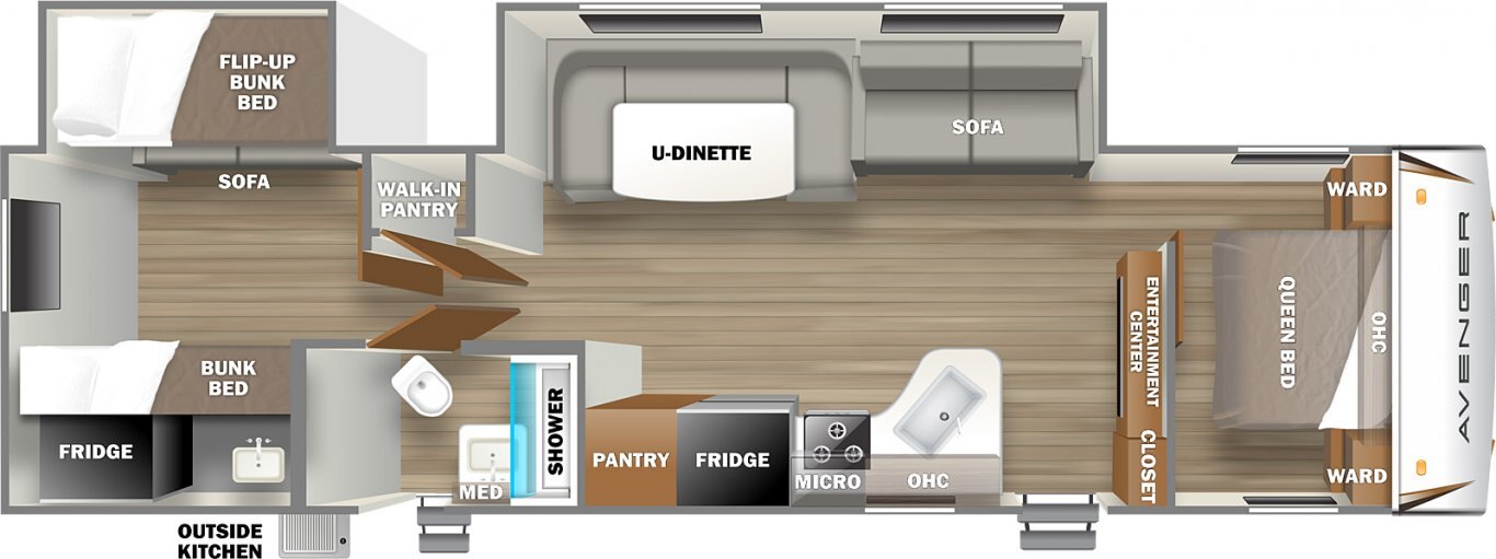 | The main living area of the Avenger 32BHS is open and stylish, with a faux rock accent wall separating the front queen bedroom from the rest of the coach. A central slideout contains the sofa and roomy U-dinette, and features large windows that provide great views of the outdoors. The kitchen is fully equipped for meals on the go with a stovetop and oven, refrigerator, and residential microwave. In the rear, the bunk room contains one elevated bunk with storage beneath, and one flip-down bunk. |