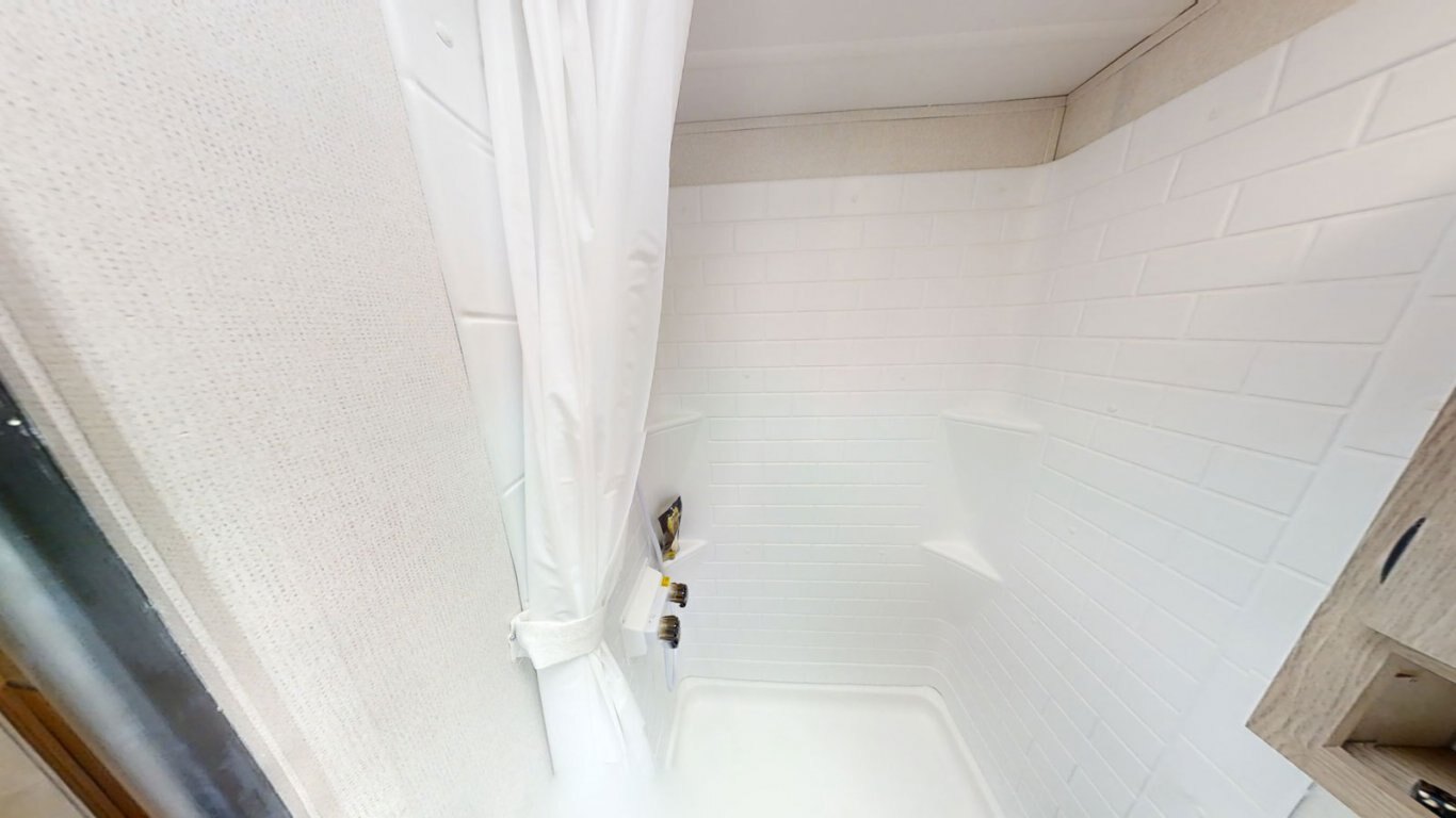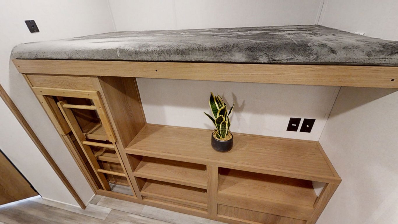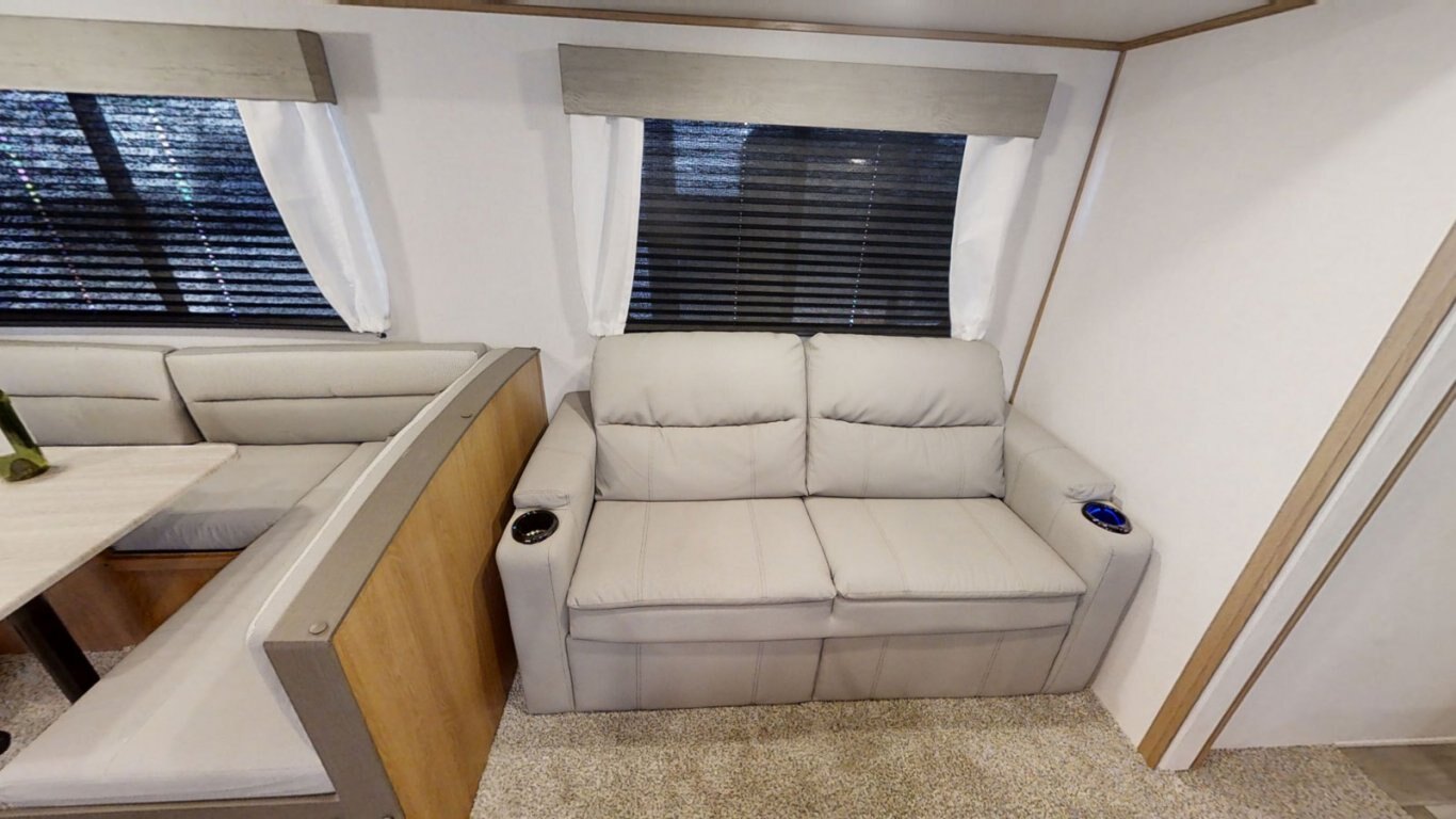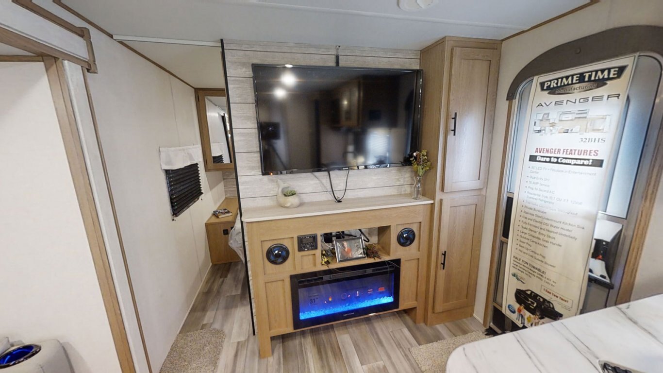 | The main living area of the Avenger 32BHS is open and stylish, with a faux rock accent wall separating the front queen bedroom from the rest of the coach. A central slideout contains the sofa and roomy U-dinette, and features large windows that provide great views of the outdoors. The kitchen is fully equipped for meals on the go with a stovetop and oven, refrigerator, and residential microwave. In the rear, the bunk room contains one elevated bunk with storage beneath, and one flip-down bunk. |