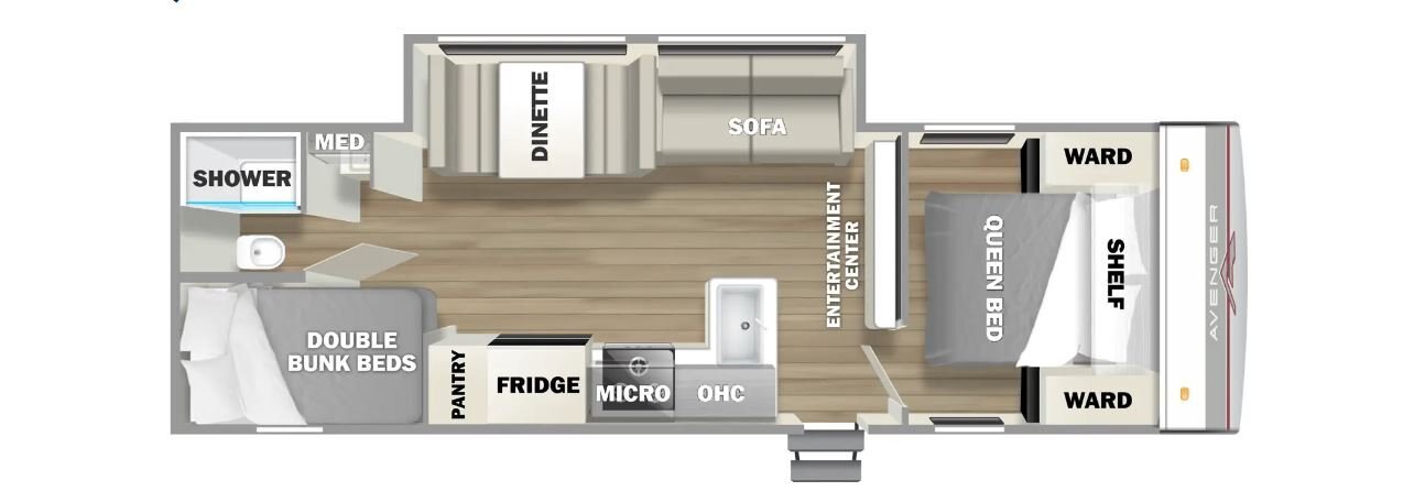 The Avenger 26DBSLE is bright and roomy, with a generous slideout and wood accents throughout the unit. The front bedroom is offset from the rest of the coach with a sliding door for added privacy. Large windows dominate the living and kitchen area, bringing in natural light and providing great views of the campsite. The rear bunk room provides a pair of double bunks with enough room to really stretch out and relax at the end of the day.