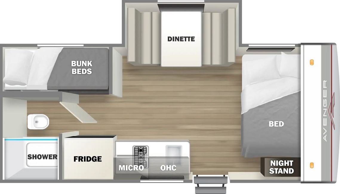 At just over 3,000 lbs, the Avenger 17BHS is a lightweight bunk model that's perfect for family getaways. There's a front queen bed with nightstand and overhead cabinets, a kitchen with a two-burner cooktop, range hood, microwave and refrigerator, plus a dinette slide for additional elbow room. The bunkroom is located in the back of the unit, right next to the full bath.