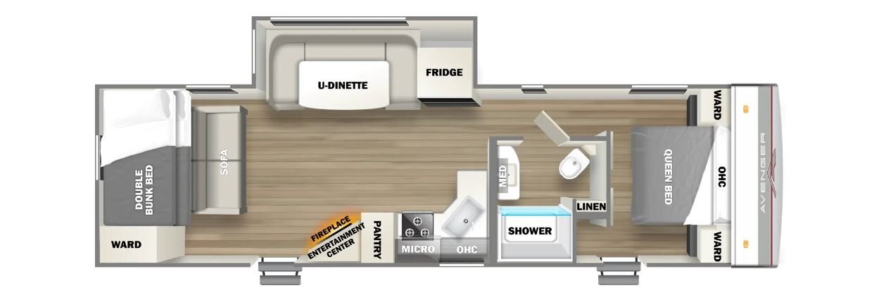 The Avenger 28BHS provides a front bedroom with walkaround queen bed and wardrobe storage. The main living area is open and roomy, with a U-shaped dinette slideout that includes a large panoramic window. The unique angled kitchen gives you glass-fronted cabinets, large stainless steel refrigerator, cooktop with oven, residential microwave, and oversized stainless steel farmhouse sink. There's a sofa running parallel to the back wall with a pair of double bunk beds behind it.