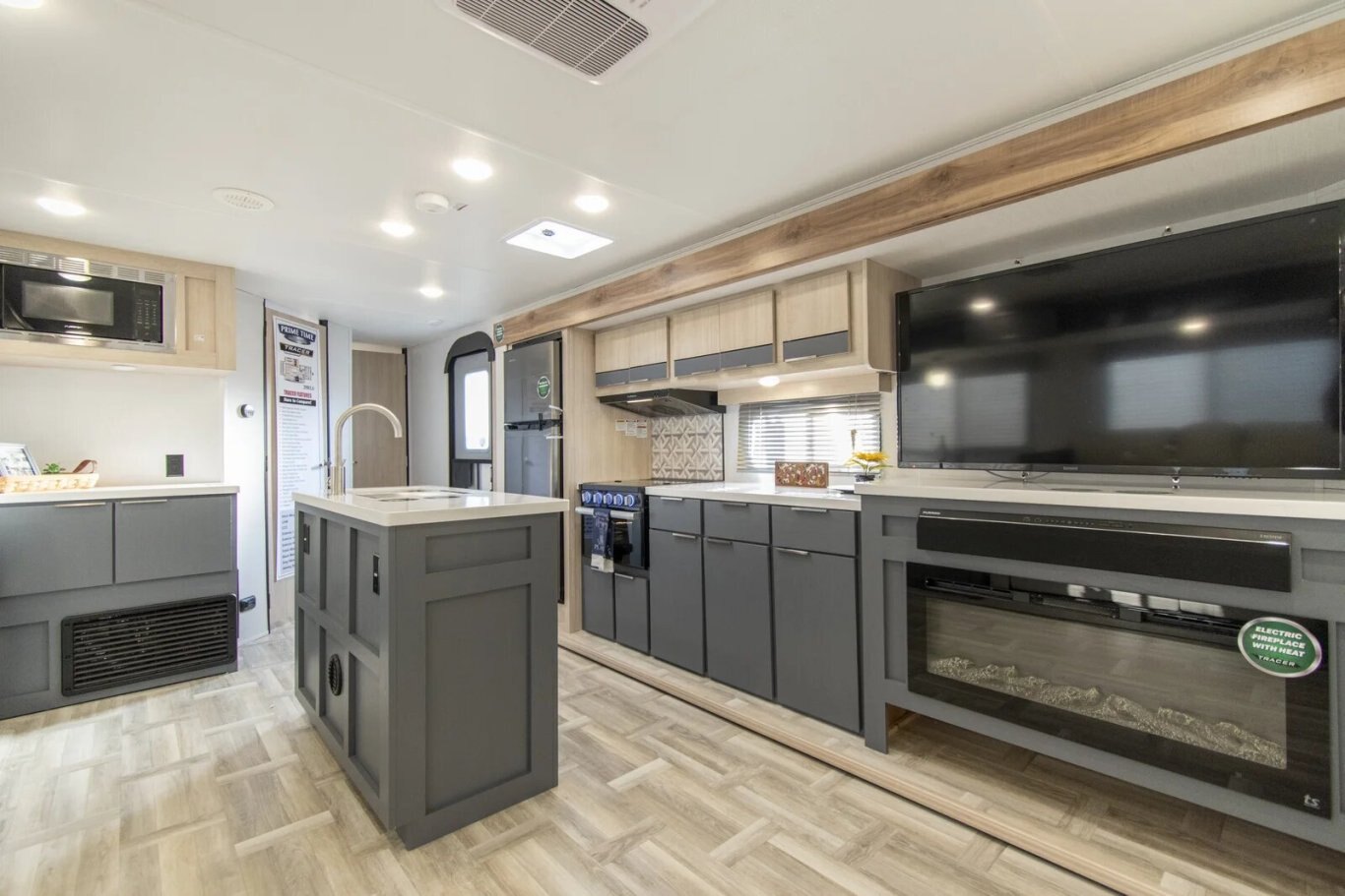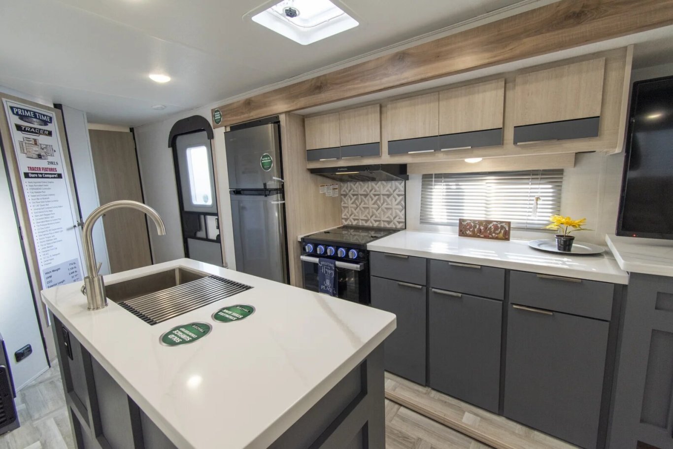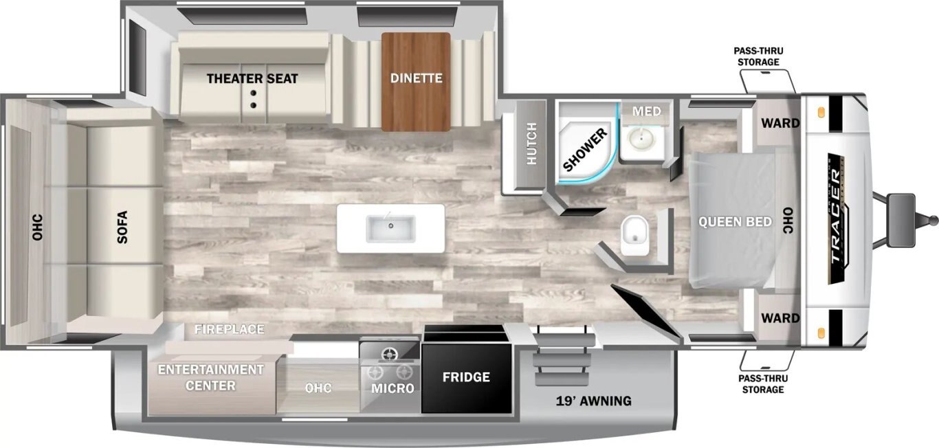 The Tracer 29RLS is a rear living model with two slideouts for extra room. There's an island kitchen with Furrion appliances, solid surface countertops, and lots of storage, thanks to a hutch and overhead cabinets. The entertainment center includes a TV, sound system, and fireplace. In the front of the unit, the queen bedroom provides storage cabinets and shelving, with doorways into the bathroom and into the main living area.