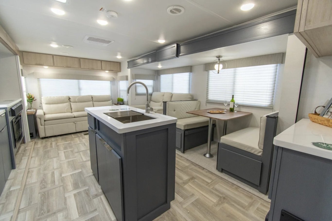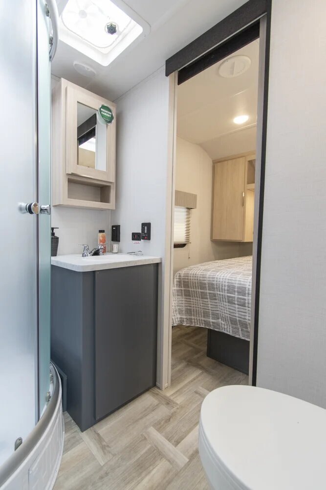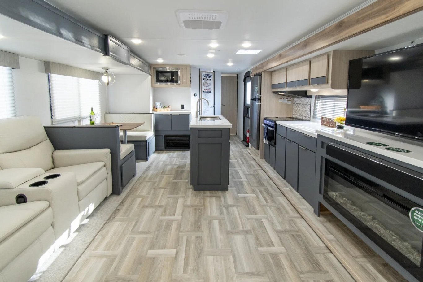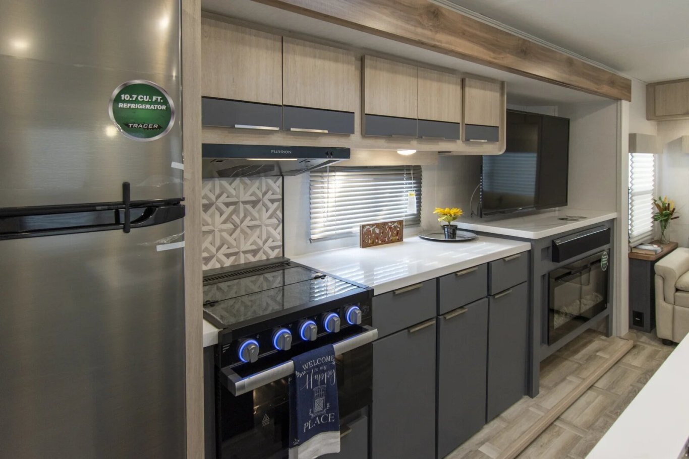 The Tracer 29RLS is a rear living model with two slideouts for extra room. There's an island kitchen with Furrion appliances, solid surface countertops, and lots of storage, thanks to a hutch and overhead cabinets. The entertainment center includes a TV, sound system, and fireplace. In the front of the unit, the queen bedroom provides storage cabinets and shelving, with doorways into the bathroom and into the main living area.