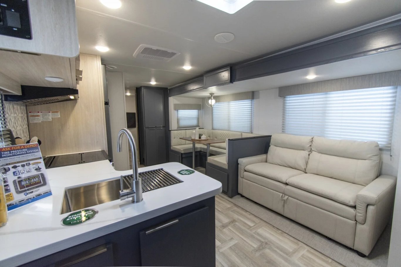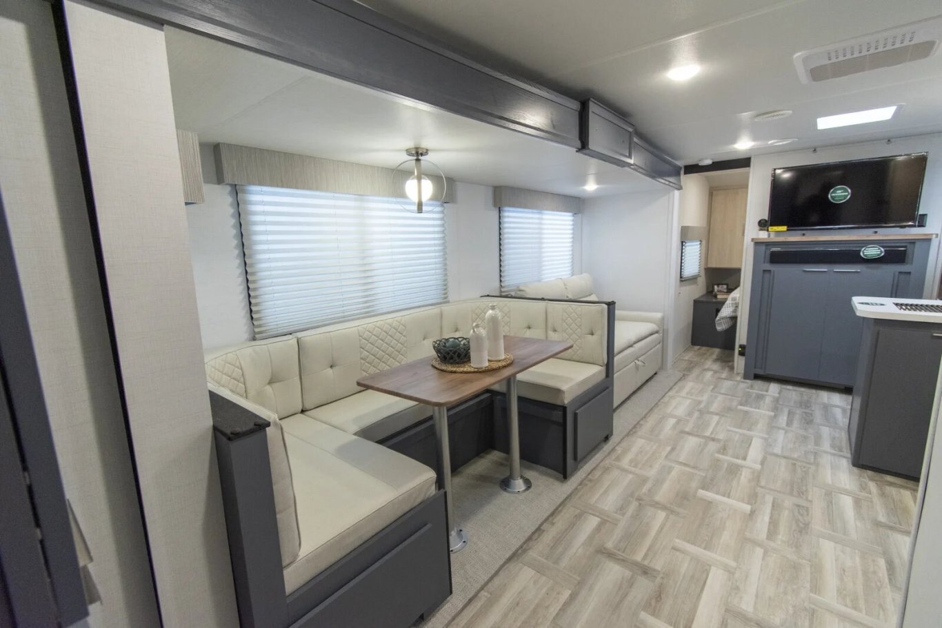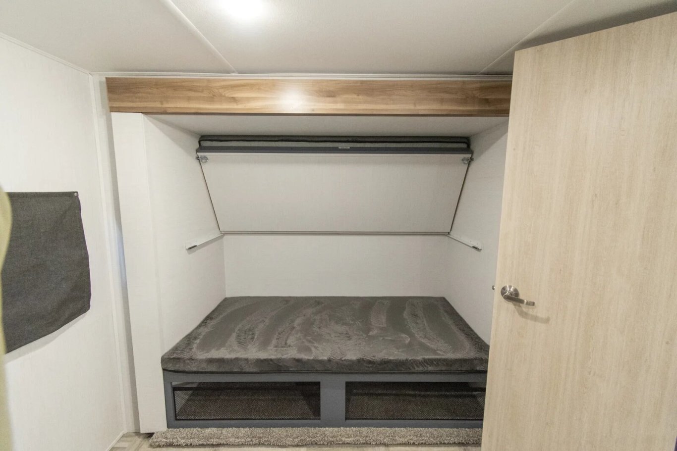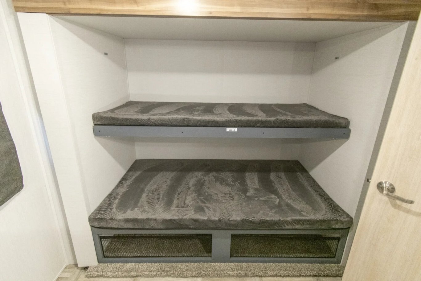 The 31BHD really sets the bar higher for a bunkhouse model, with a slideout, four bunk beds, storage cubbies, and a wardrobe cabinet in the rear of the unit. There's another slideout in the main living area that holds our ever-popular U-shaped booth dinette that gives you under-bench storage, plus a sofa. There's a floor-to-ceiling pantry for kitchen storage, plus additional overhead cabinets. The Furrion appliances make mealtime a breeze, with everything you need for cooking away from home.
