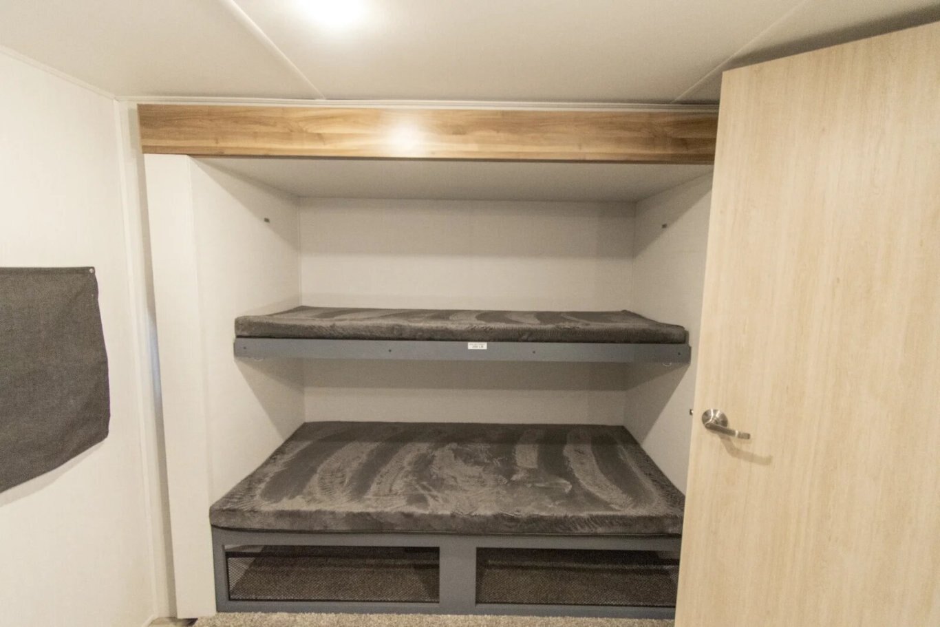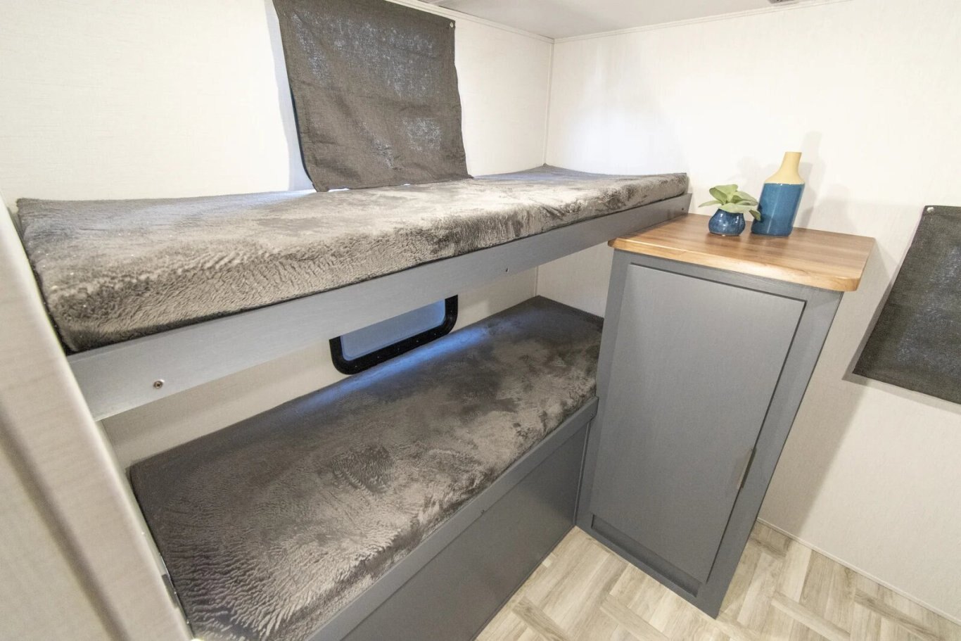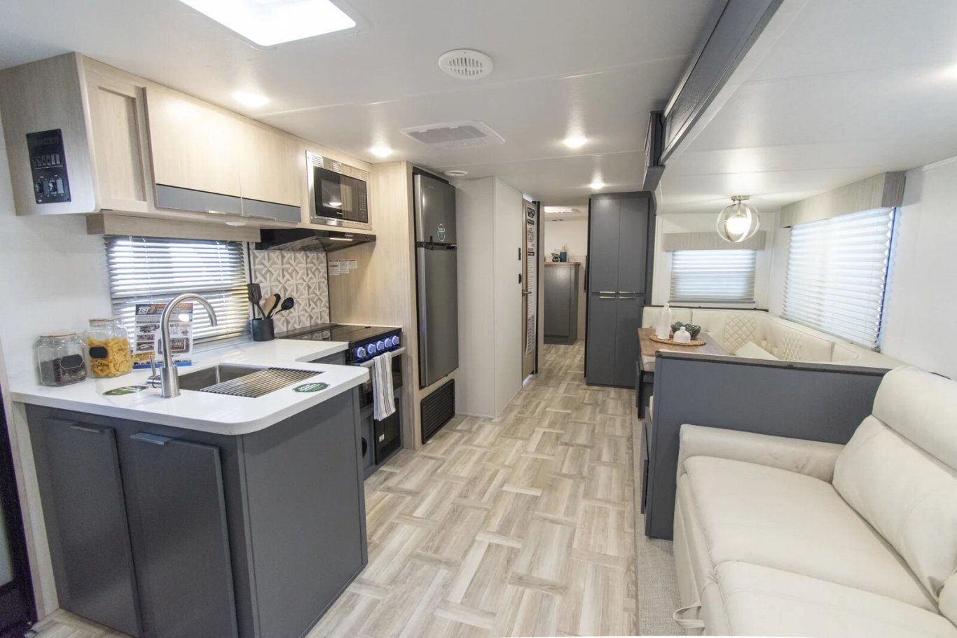 The 31BHD really sets the bar higher for a bunkhouse model, with a slideout, four bunk beds, storage cubbies, and a wardrobe cabinet in the rear of the unit. There's another slideout in the main living area that holds our ever-popular U-shaped booth dinette that gives you under-bench storage, plus a sofa. There's a floor-to-ceiling pantry for kitchen storage, plus additional overhead cabinets. The Furrion appliances make mealtime a breeze, with everything you need for cooking away from home.