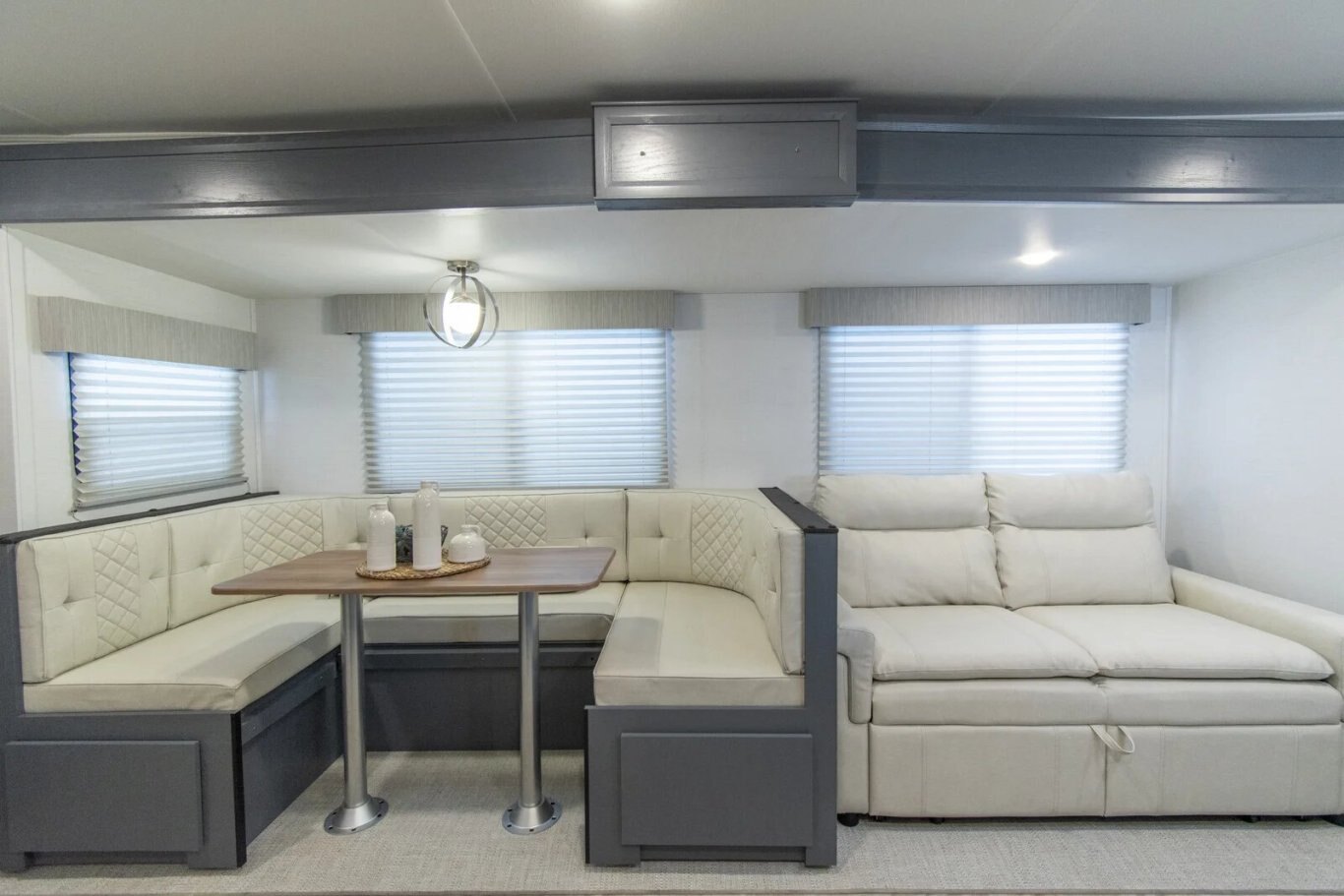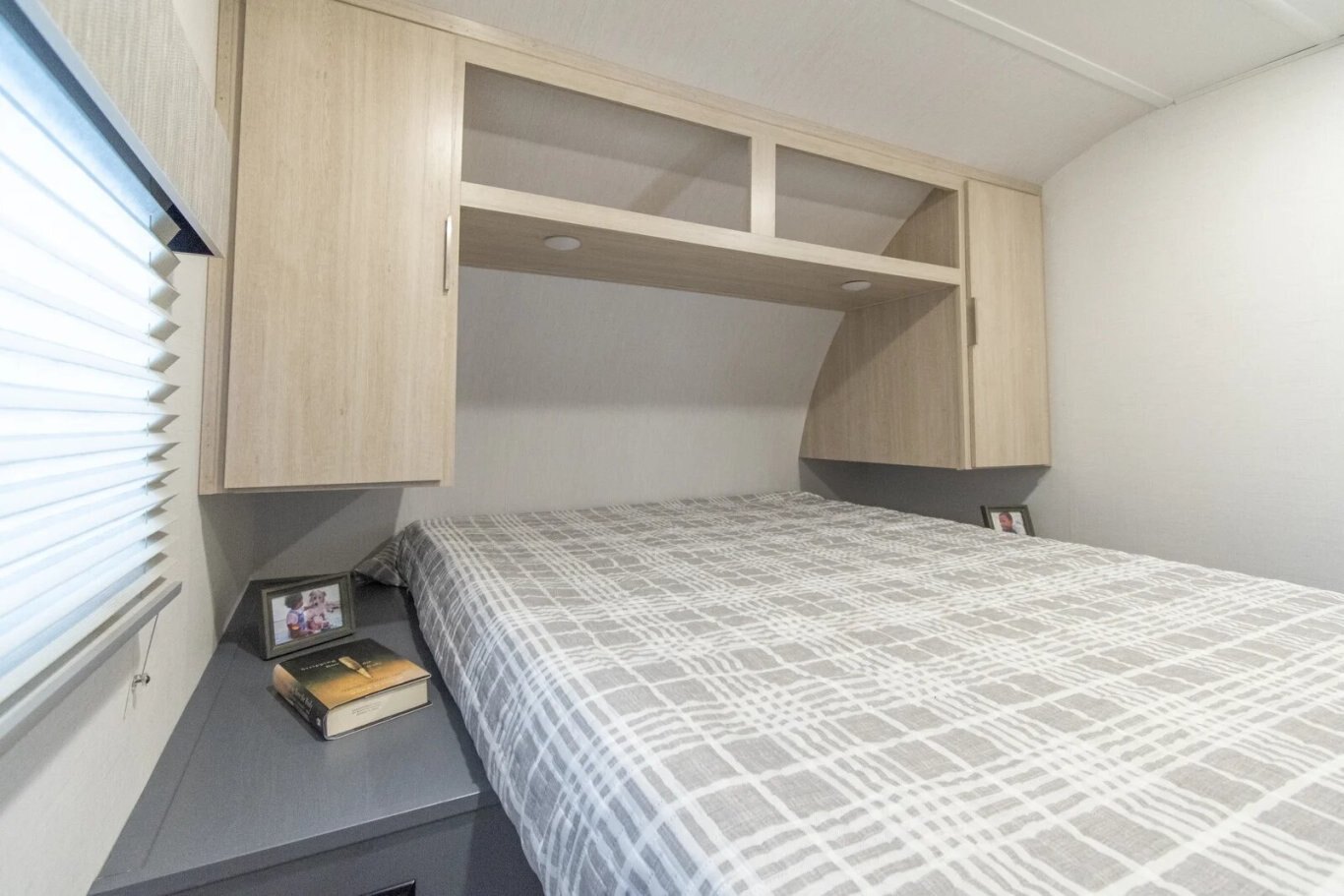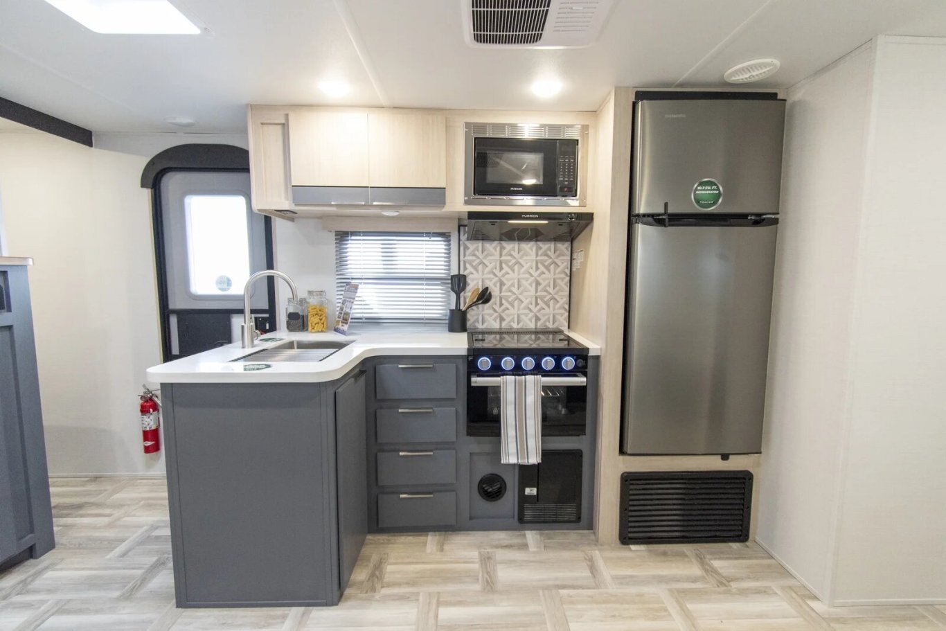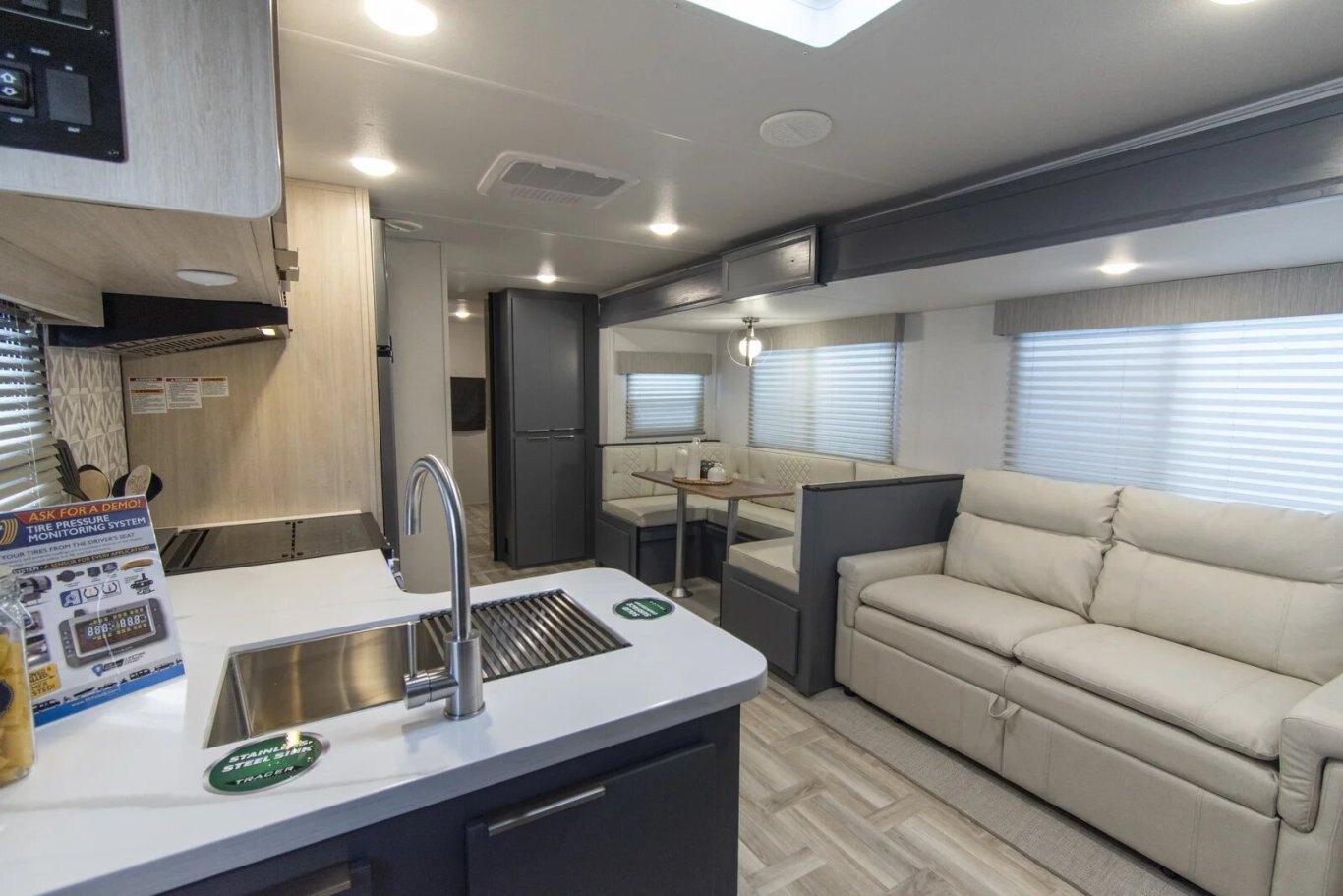 The 31BHD really sets the bar higher for a bunkhouse model, with a slideout, four bunk beds, storage cubbies, and a wardrobe cabinet in the rear of the unit. There's another slideout in the main living area that holds our ever-popular U-shaped booth dinette that gives you under-bench storage, plus a sofa. There's a floor-to-ceiling pantry for kitchen storage, plus additional overhead cabinets. The Furrion appliances make mealtime a breeze, with everything you need for cooking away from home.