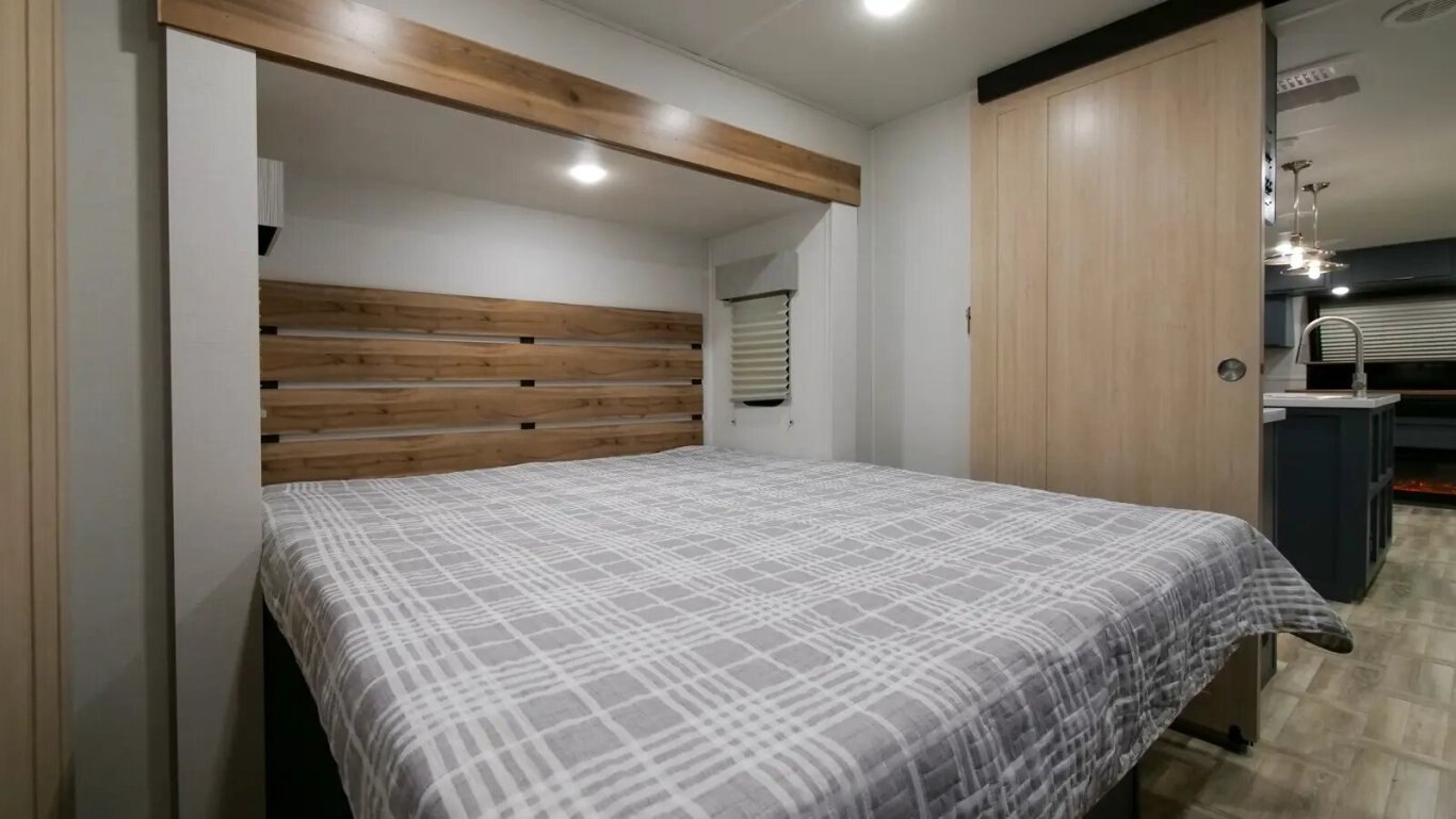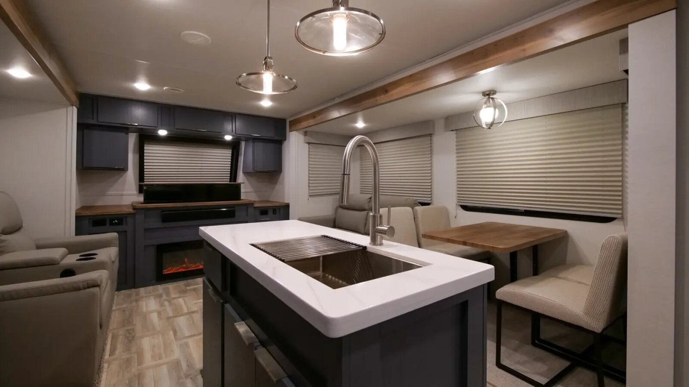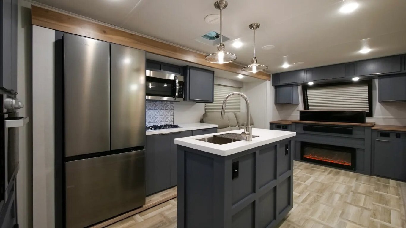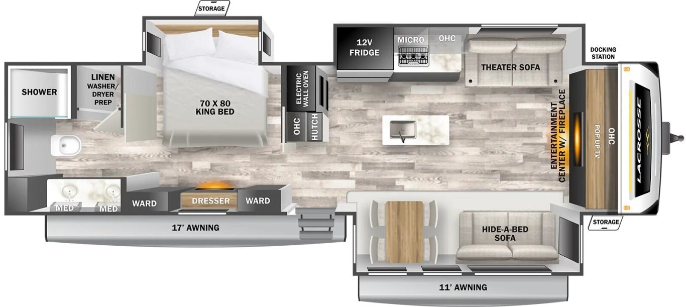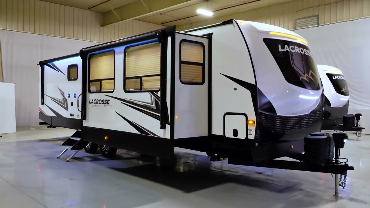 | The all-new 3375FE Lacrosse travel trailer is full of innovative features—like a 50" lift TV that tucks away when not in use, an electric wall-mounted oven, a 3-burner chef collection cooktop with cast iron grates, and a 17 CU. FT. 12V stainless steel French door refrigerator! You also get a large bedroom with 70" x 80" king bed, wardrobe cabinets, and unique fireplace/dresser combo. The rear bathroom provides a 30" x 40" molded shower with glass doors and a dual sink vanity. |