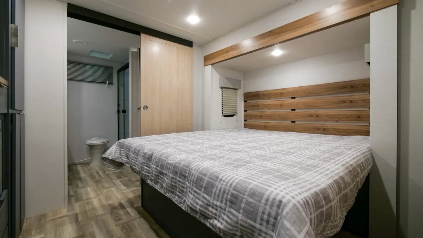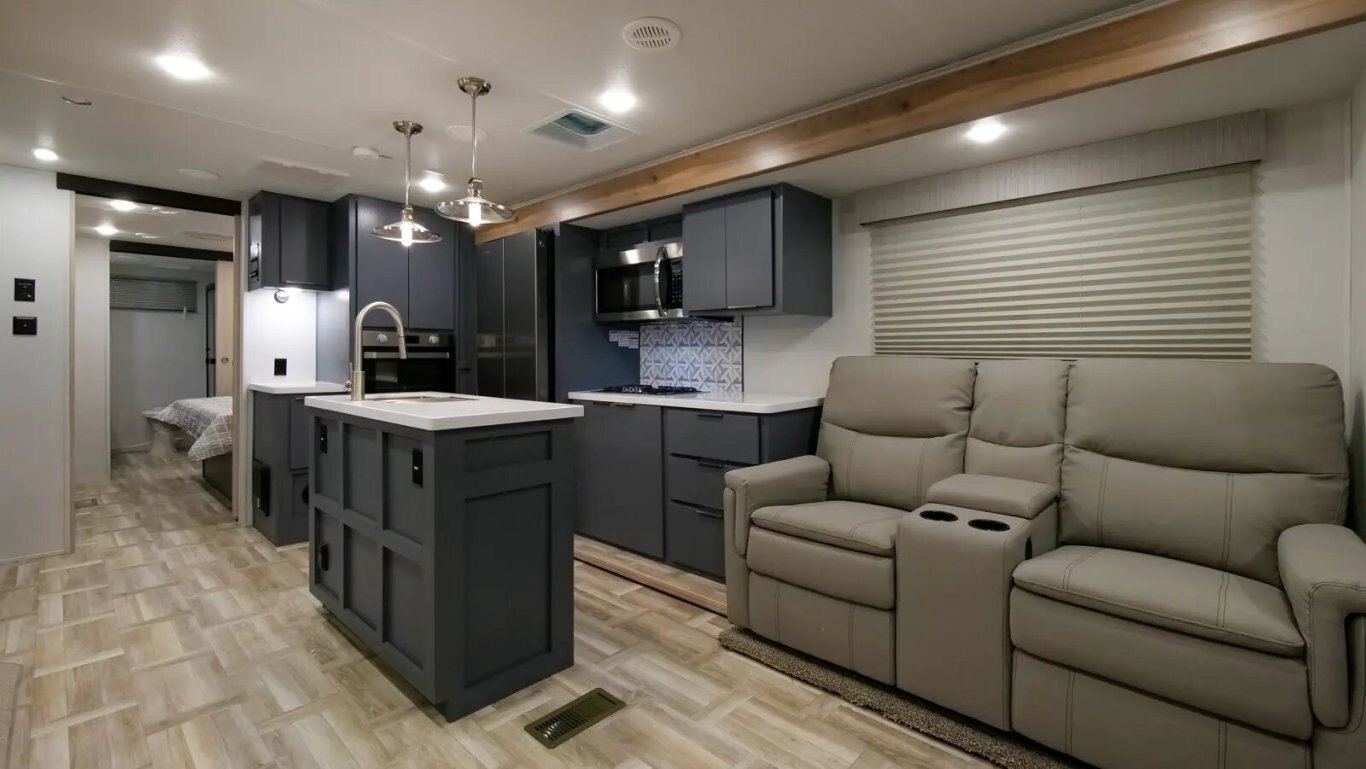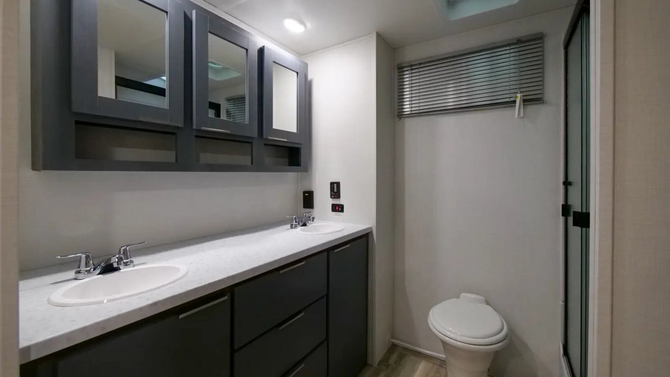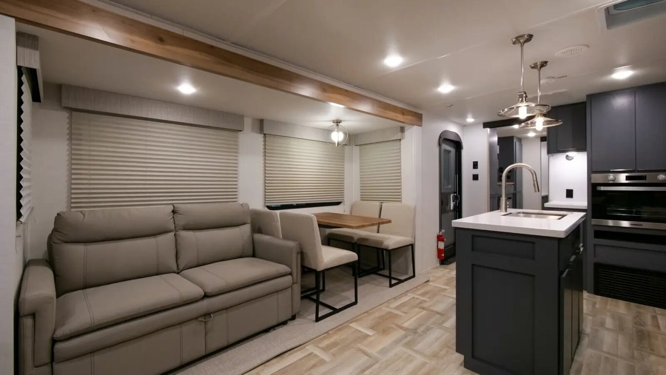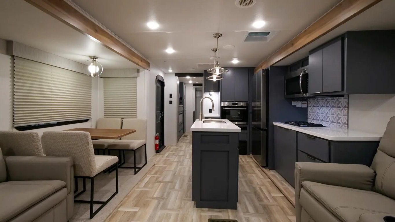 | The all-new 3375FE Lacrosse travel trailer is full of innovative features—like a 50" lift TV that tucks away when not in use, an electric wall-mounted oven, a 3-burner chef collection cooktop with cast iron grates, and a 17 CU. FT. 12V stainless steel French door refrigerator! You also get a large bedroom with 70" x 80" king bed, wardrobe cabinets, and unique fireplace/dresser combo. The rear bathroom provides a 30" x 40" molded shower with glass doors and a dual sink vanity. |