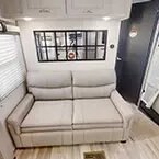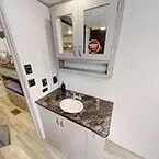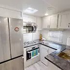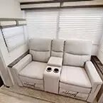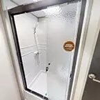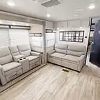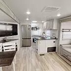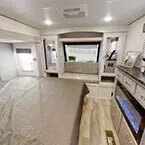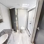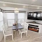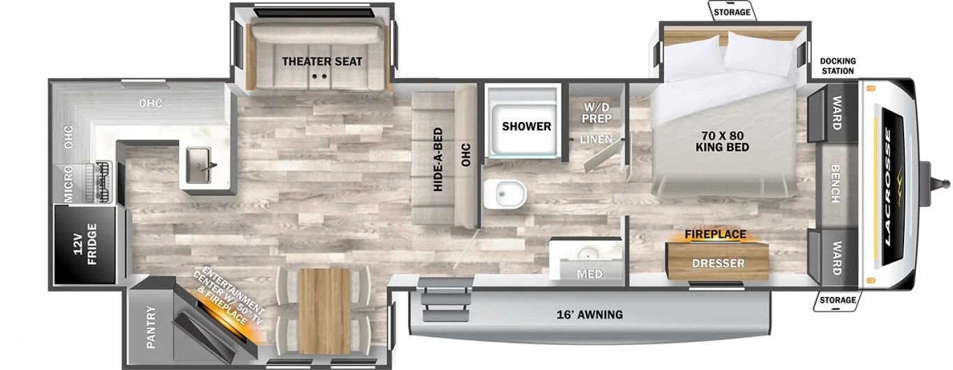 | The Lacrosse 3411RK is a favorite in our lineup, with several unique touches you won't find anywhere else. First, in the front master bedroom, there's a 70" x 80" walkaround king bed with slideout, wardrobe closets, a reading bench, and a dresser/fireplace combo. The bathroom is generously sized, with a residential shower with molded seat and glass doors, porcelain toilet, vanity sink with countertop, and double medicine cabinet for all the essentials. |