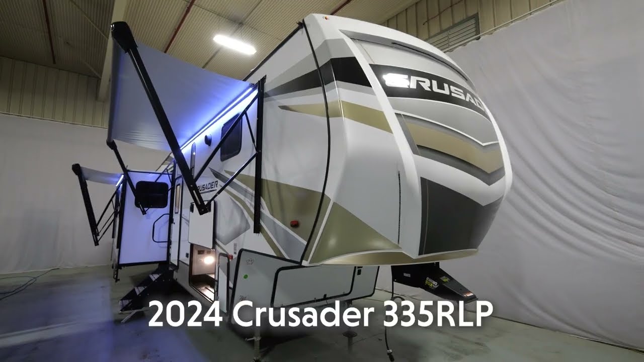 The Crusader 335RLP is a modern farmhouse mid-profile coach with many features that are more often seen in high-profile luxury fifth wheels. The front bedroom features a residential king bed with slideout for extra room, plus a walk-in closet with washer/dryer prep. The bathroom provides a 48" one-piece shower surround with built-in seat and glass doors, plus a porcelain toilet and linen cupboard. In the kitchen, there's a butcher block island, residential 24" oven, and 12 CU. FT. refrigerator.