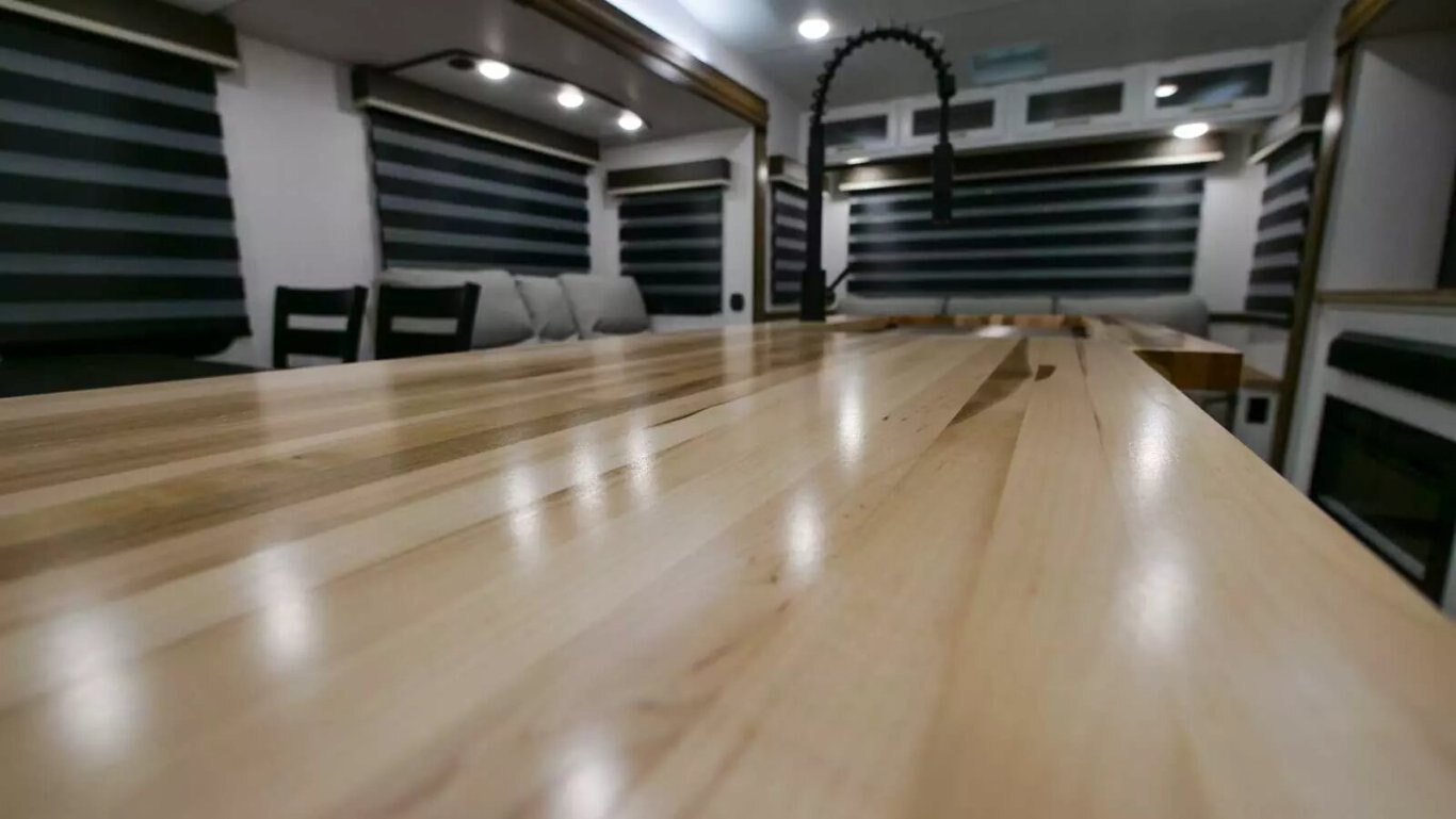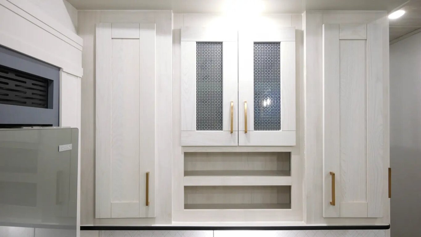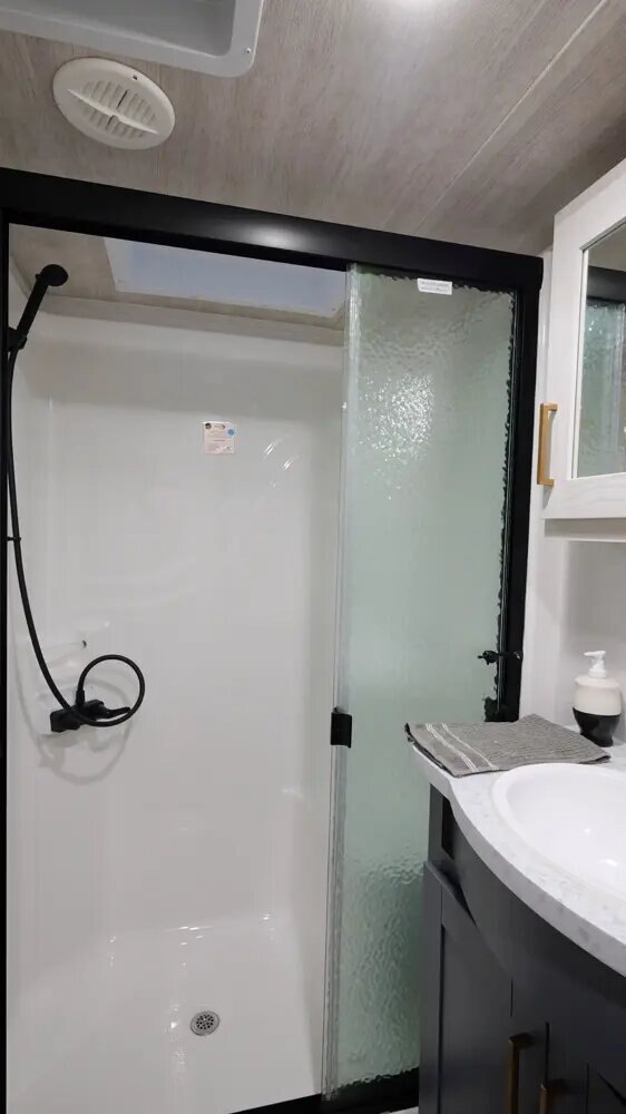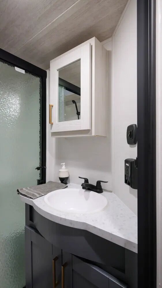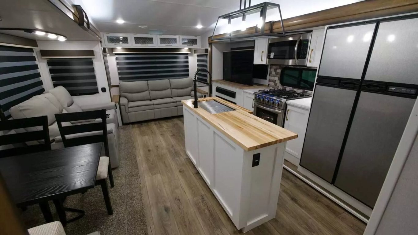 The Crusader 305RLP is the perfect couple's coach! There's a front queen bedroom with a wardrobe slide for extra storage, plus nightstands with power outlets for charging your devices. The bathroom features a residential shower with built-in seat and glass doors, plus a linen closet. In the kitchen, there's a hutch and a walk-in pantry for storage, so you won't need to leave anything behind. The central island has a butcher block countertop and farmhouse sink with sprayer faucet.