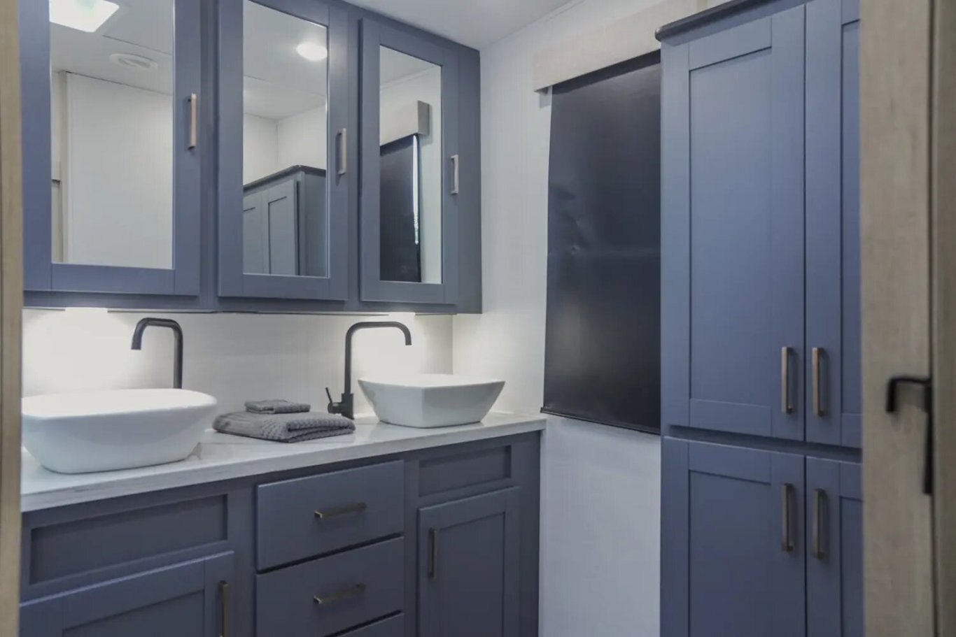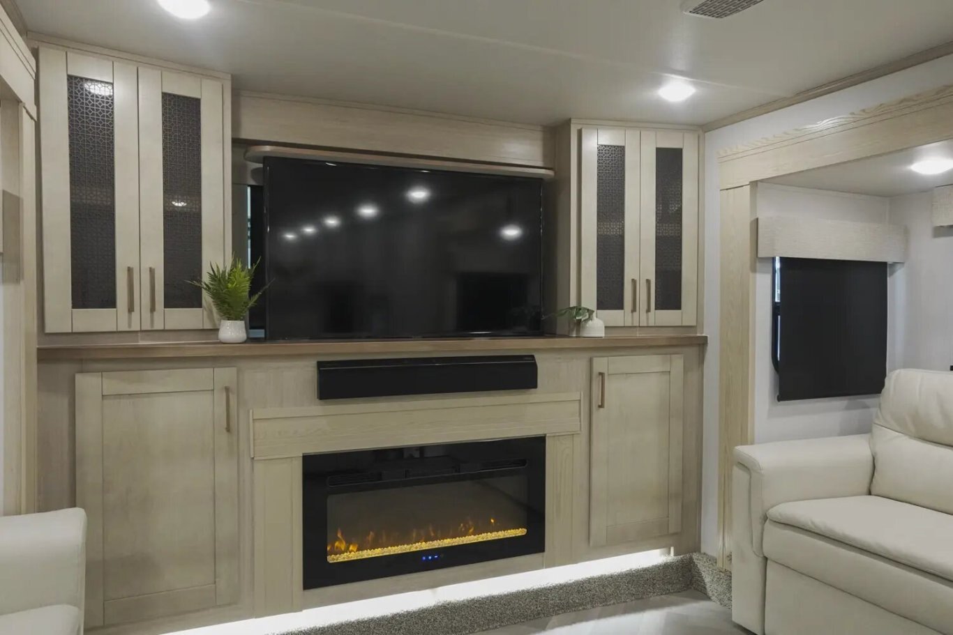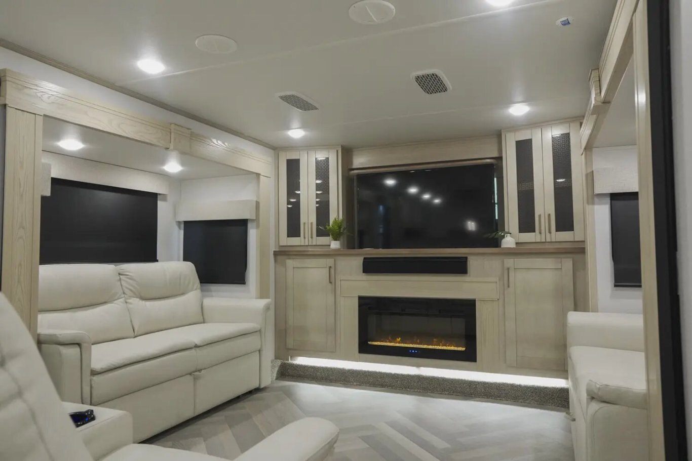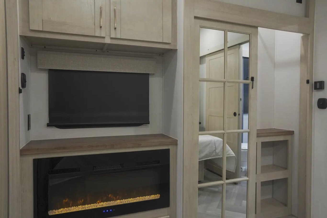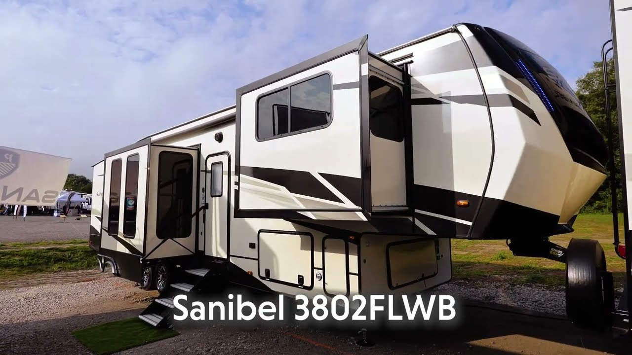 The Sanibel 3802FLWB is perfect for entertaining, with an elevated large front living room that features two slideouts with EZ-Glide couches, 65" theater seating, and a large entertainment center with pop-up TV. The central kitchen features a half-wall hutch area that gives you additional cabinets plus a nice long countertop for small appliances or meal prep, plus a bonus half bath in the corner. The master suite is separated from the rest of the unit with a stylish sliding barn door.
