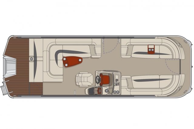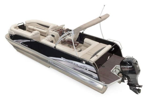 Prestige Edition: Prestige Edition logo on both sides, monochrome upholstery with "Reflection" vinyl, DEL lighting on floor, bimini top, pontoon logs, speakers and fixed cup holders, upgraded stainless steel ladder and 2-tone snack table.